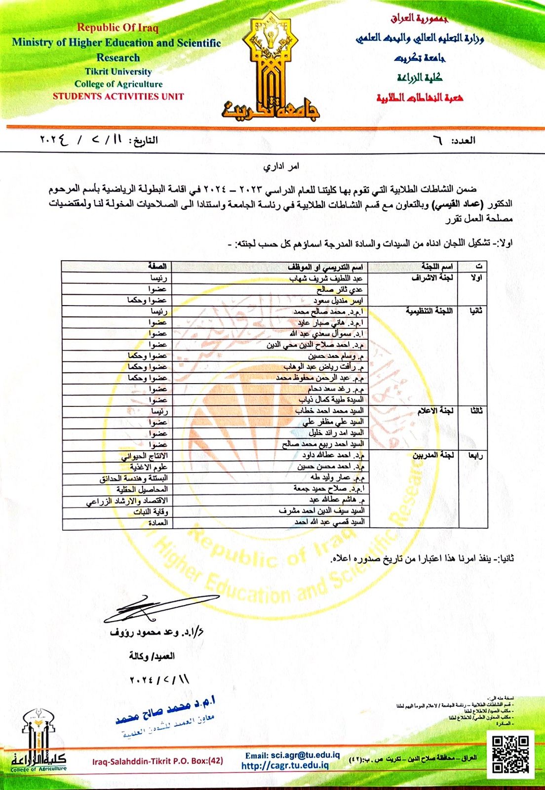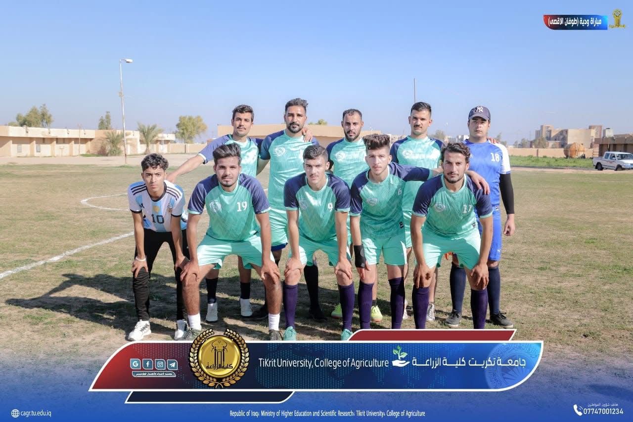 ضمن الفعاليات التي تقيمها شعبة النشاطات الطلابية بكلية الزراعة وبالتعاون مع قسم النشاطات الرياضية في رئاسة جامعة تكريت.. احتضن ملعب كلية الزراعة بطولة المرحوم عماد القيسي والتي شهدت سلسلة من المباريات القوية على مدار أسبوع.. ليتوج فريق المحاصيل الحقلية بالبطولة والتي حضر مباراتها النهائية السيد معاون العميد للشؤون العلمية الاستاذ المساعد الدكتور محمد صالح محمد