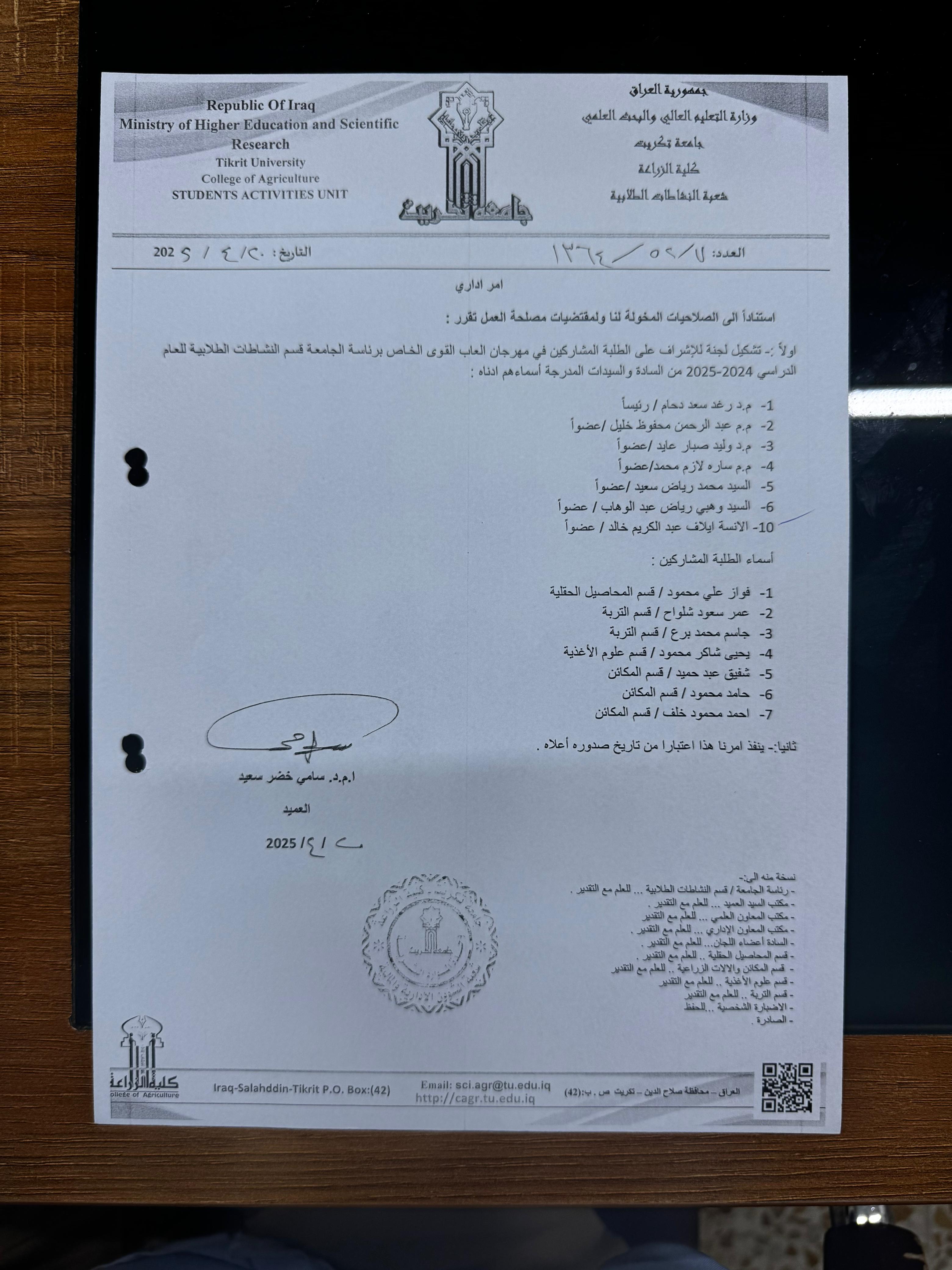 برعاية قسم النشاطات الطلابية في رئاسة جامعة تكريت، شاركت كلية الزراعة بسبعة من طلبتها في بطولة ألعاب القوى.