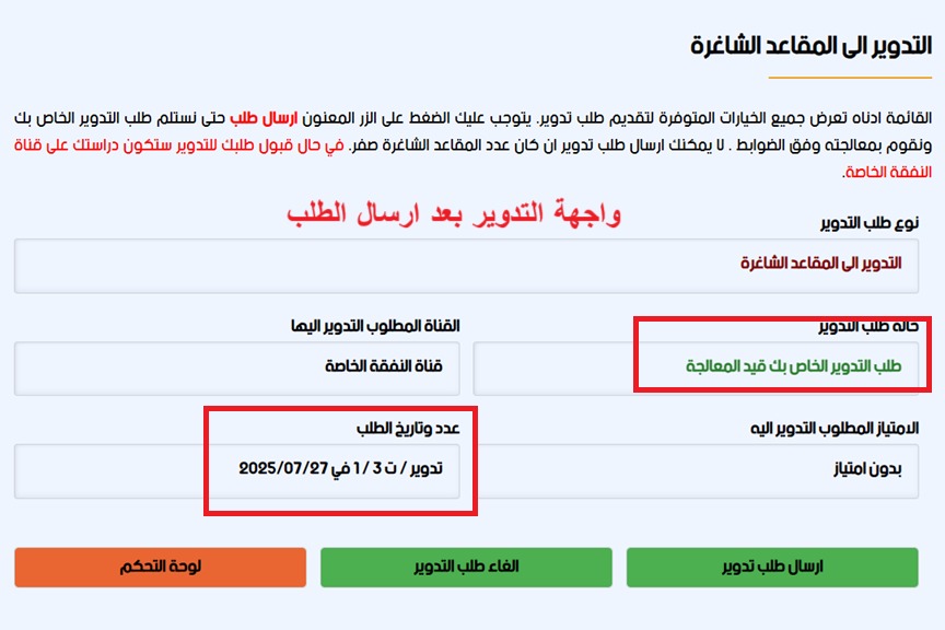 - يحق التدوير فقط على المقاعد الشاغرة في الخطة ضمن قناة النفقة الخاصة ولا يوجد تدوير على المقاعد الشاغرة الخاصة بالامتيازات في الوقت الحالي