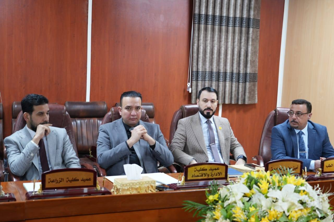 ضمن سلسلة الاجتماعات الدورية لمتابعة سير العمل في الجامعة ترأس الاستاذ الدكتور حسن حسين ابراهيم مساعد رئيس الجامعة للشؤون العلمية اجتماعاً ضم السادة معاوني عمداء الكليات للشؤون العلمية في الجامعة وتم خلال الاجتماع مناقشة سير العمل في كليات الجامعة والمهام العلمية والتعليمية الملقاة على عاتقهم , وتناول الاجتماع المشكلات والمعوقات التي تعترض سير العملية التعليمية ومناقشة سبل تجاوزها بما ينسجم مع المصلحة العامة للجامعة.