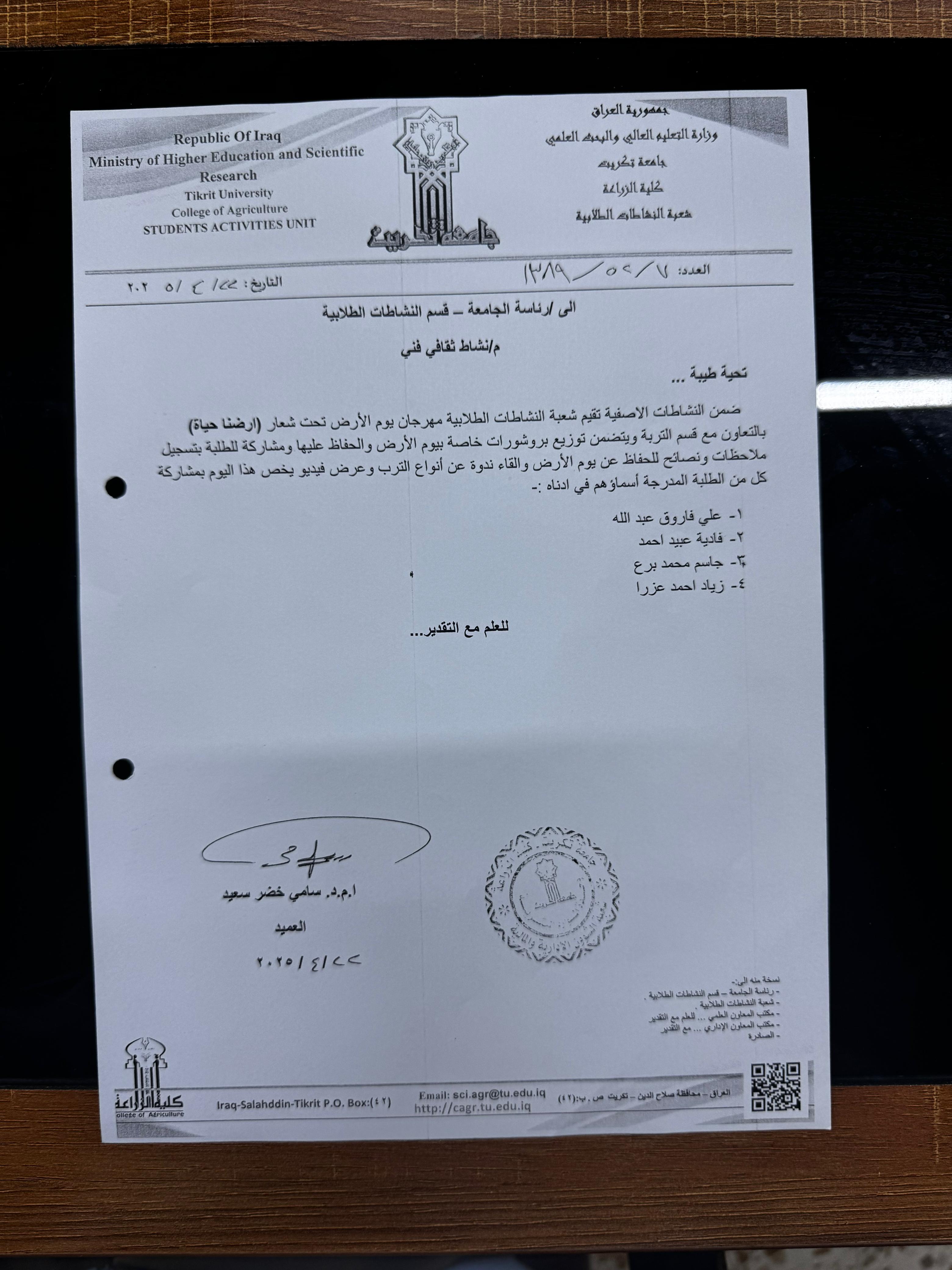 برعاية السيد رئيس جامعة تكريت الأستاذ الدكتور وعد محمود رؤوف، وبإشراف السيد عميد كلية الزراعة الأستاذ المساعد الدكتور سامي خضر سعيد.. أقامت شعبة النشاطات الطلابية بالتعاون مع قسم التربة والموارد المائية مهرجانا بمناسبة يوم الأرض تحت عنوان:
