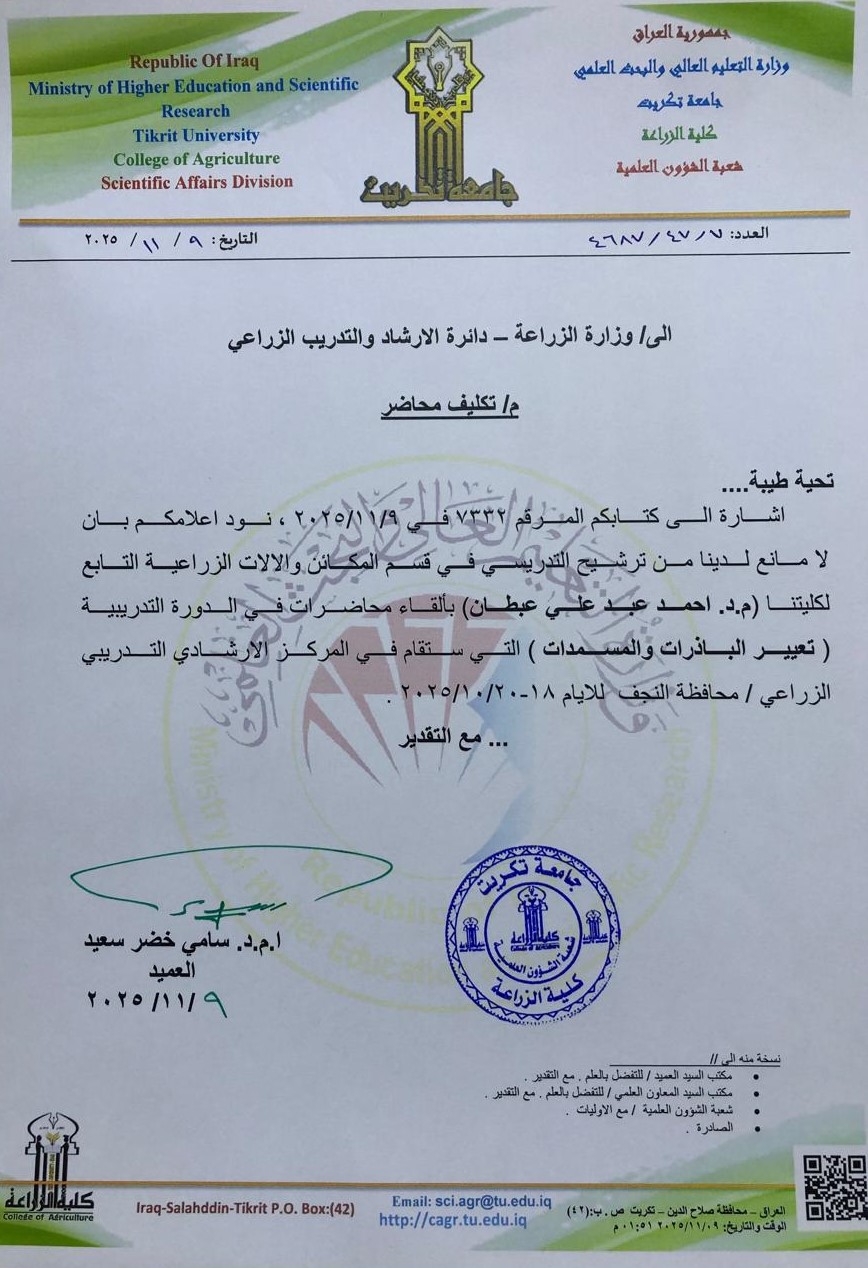 وشهدت فعاليات الاختتام حضور عدد من مديري الأقسام الفنية، والمدير التنفيذي لبرنامج بذور المحاصيل الإستراتيجية المتحملة للملوحة والجفاف، فيما شارك في الدورة 35 متدرباً من المراكز الإرشادية ومديريات الزراعة من مختلف المحافظات ممّن يمتلكون الخبرة والاختصاص. وتضمّن المنهاج التدريبي سلسلة محاضرات علمية متقدمة قدّمها الدكتور أحمد عبد علي عبطان من كلية الزراعة – جامعة تكريت، إضافة إلى تدريب عملي مكثف شمل فحص الباذرات، وتقييم جاهزيتها، وتنظيم عناصرها الميكانيكية، مع تطبيقات ميدانية لضبط عمق البذار باستخدام أحدث التقانات الحديثة.