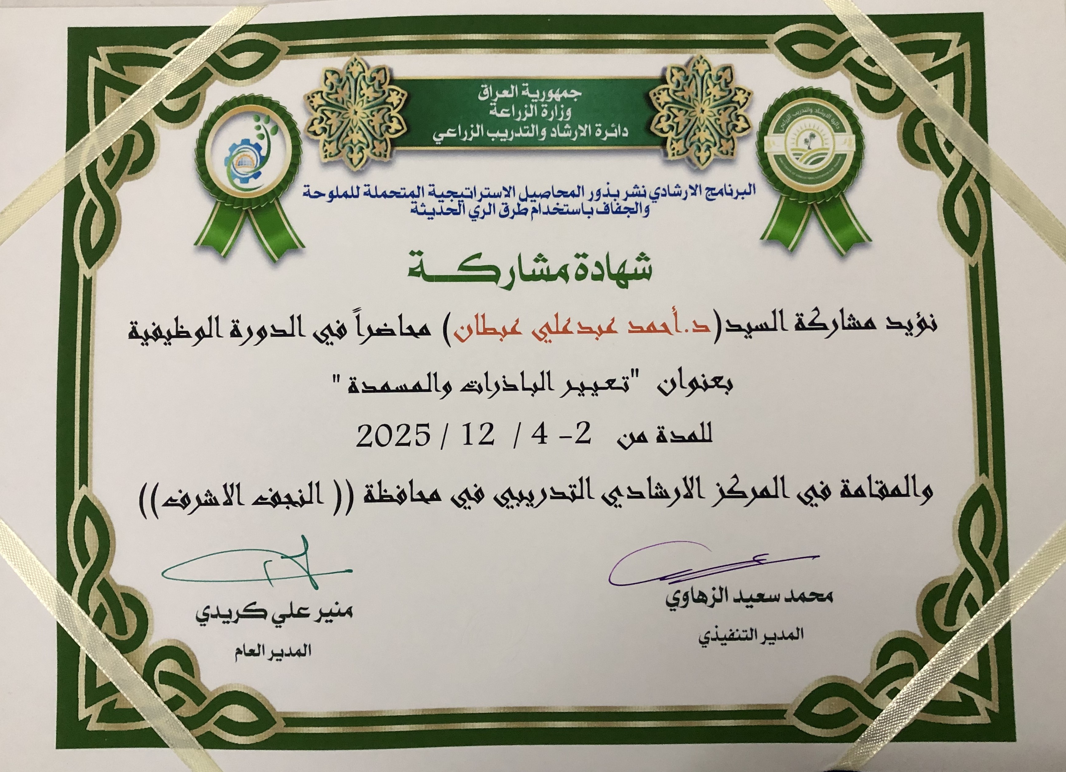 اختتمت دائرة الإرشاد والتدريب الزراعي في وزارة الزراعة أعمال دورتها التدريبية الوظيفية المركزية الموسومة "تعيير الباذرات والمسمدة"، التي نُفّذت على قاعة المركز الإرشادي في محافظة النجف الأشرف للفترة من 2 إلى 4 كانون الأول 2025، وذلك استنادًا إلى توجيهات وزير الزراعة الدكتور عباس جبر العلي المالكي، وبإشراف مباشر من المدير العام للدائرة المهندس منير علي كريدي.