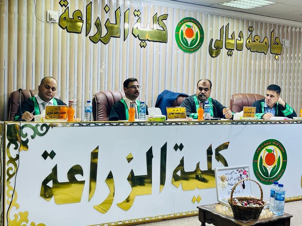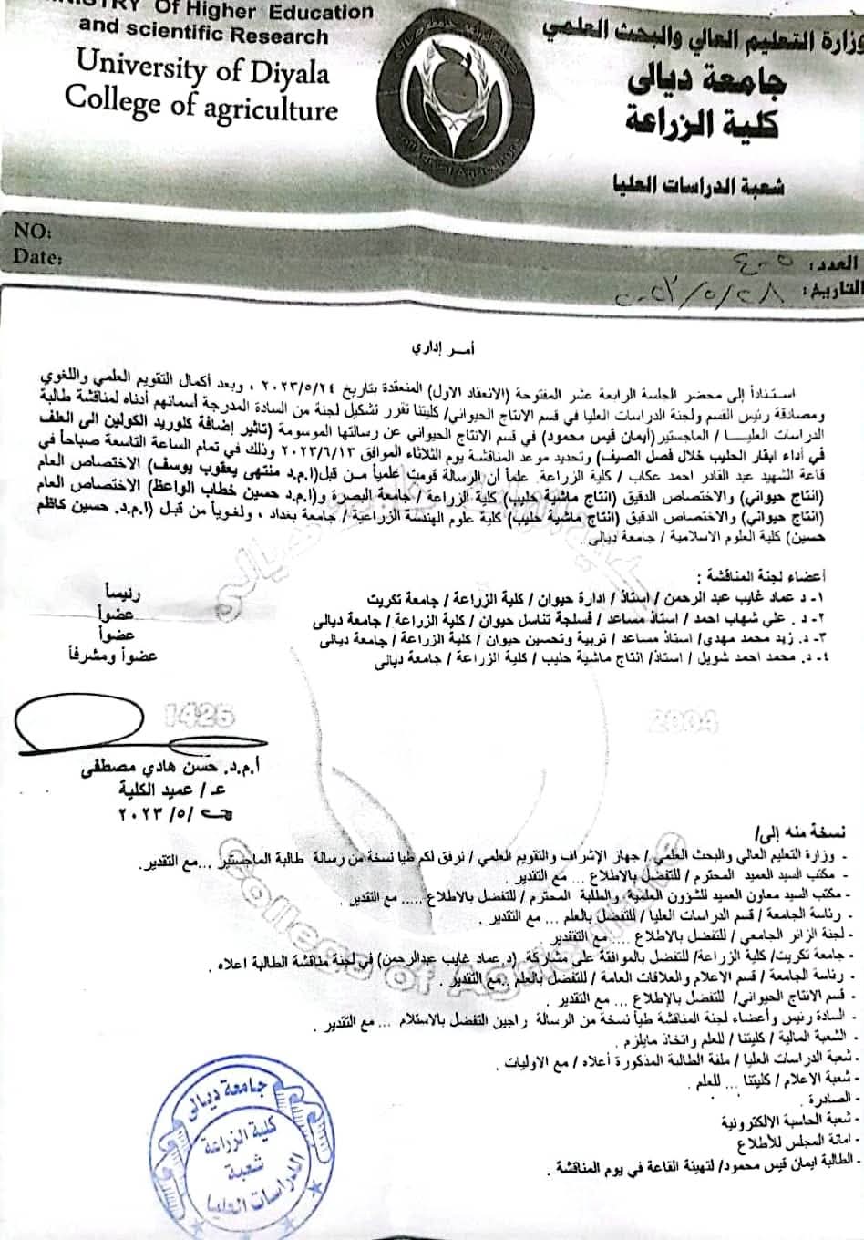 ترأس التدريسي في كلية الزراعة - جامعة تكريت لجنة مناقشة طالبة الدراسات العليا / الماجستير أيمان فيس (محمود) في قسم الانتاج الحيواني - كلية الزراعة - جامعة ديالى عن رسالتها الموسومة (تاثير إضافة كلوريد الكولين الى العلف في أداء ابقار الحليب خلال فصل الصيف وتحديد موعد المناقشة يوم الثلاثاء الموافق 2023/6/13
