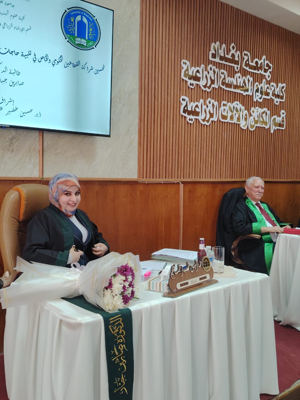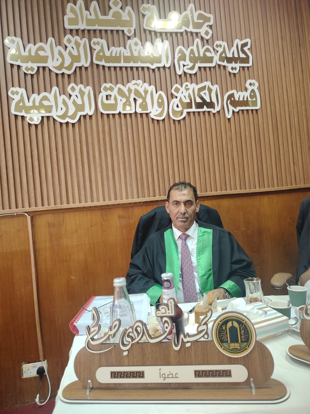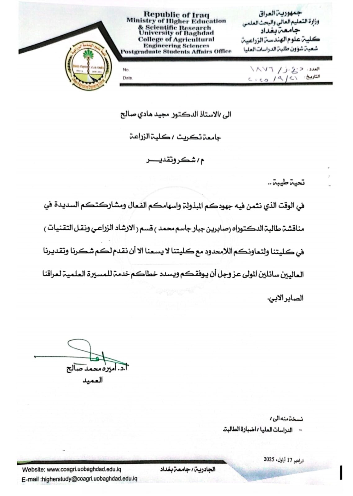في إطار التعاون الأكاديمي بين الجامعات العراقية.. شارك الاستاذ الدكتور مجيد هادي صالح بعضوية لجنة مناقشة لرسالة الدكتوراه المقدمة من الطالبة صابرين بجار جاسم محمد، من قسم الإرشاد الزراعي ونقل التقنيات في كلية الهندسة الزراعة بجامعة بغداد والت كانت بعنوان
