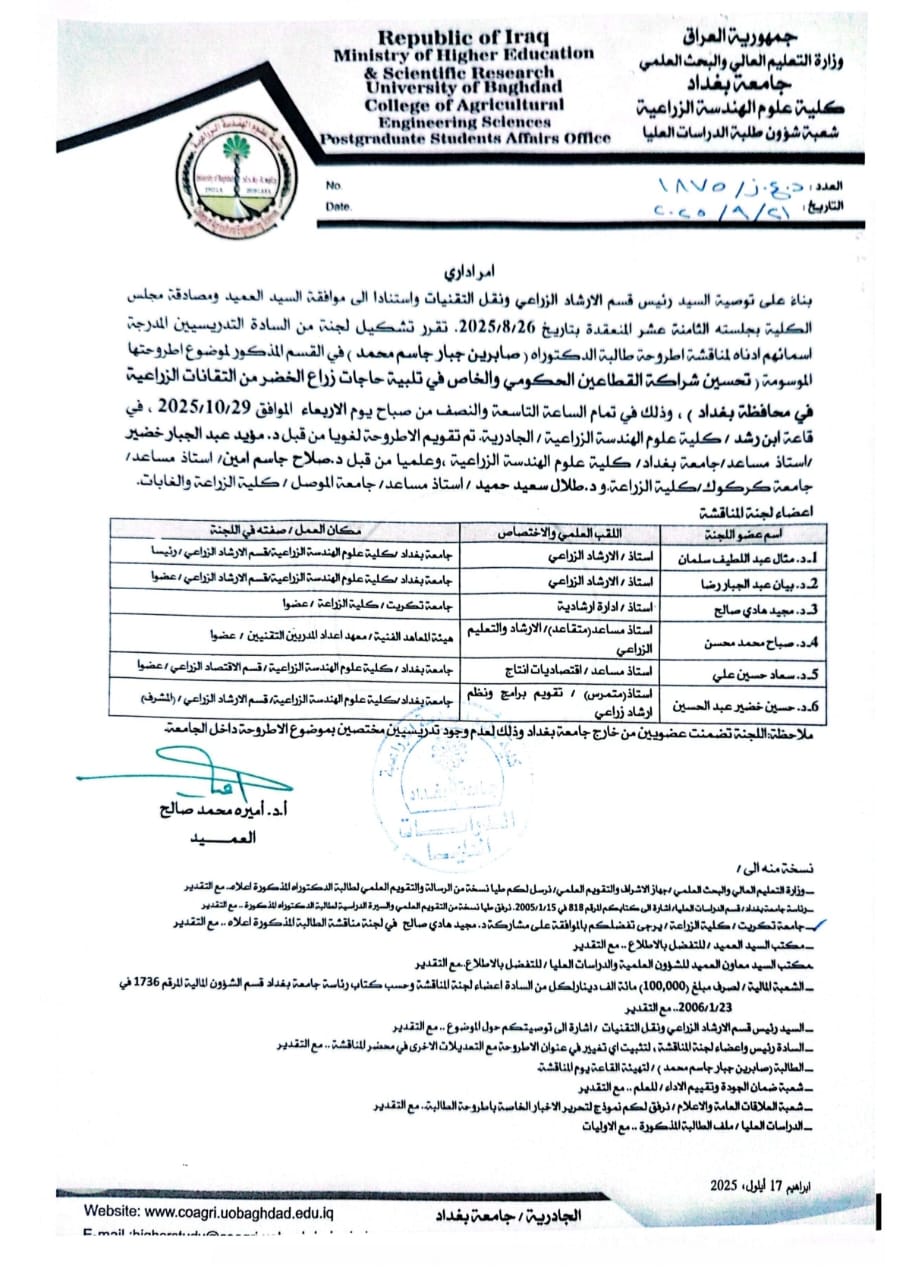 وضمت اللجنة عددًا من الأساتذة المتخصصين في مجالات الإرشاد الزراعي، والإنتاج النباتي، ونقل التقنيات الزراعية من جامعة بغداد والجامعات العراقية الأخرى، إلى جانب إشراف الأستاذ الدكتور جهاد عبد الجبار خضير على الرسالة.