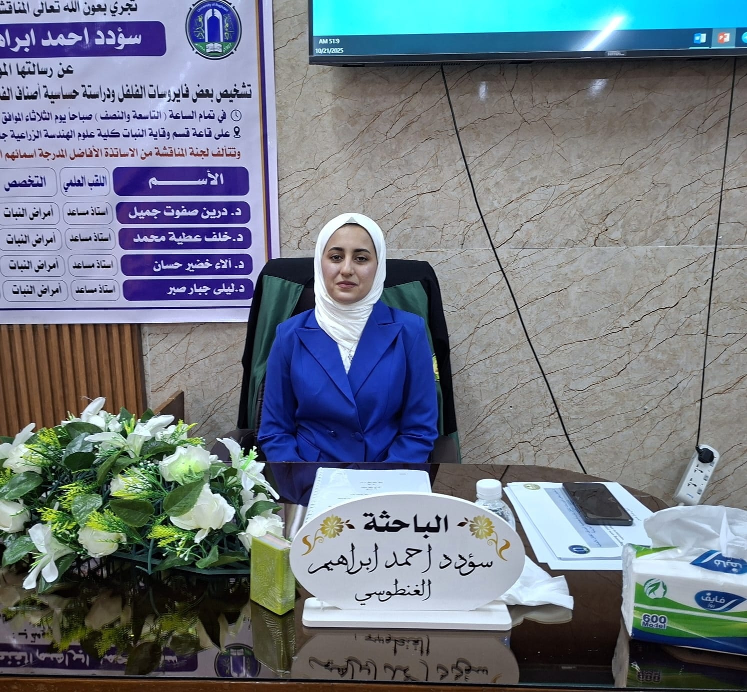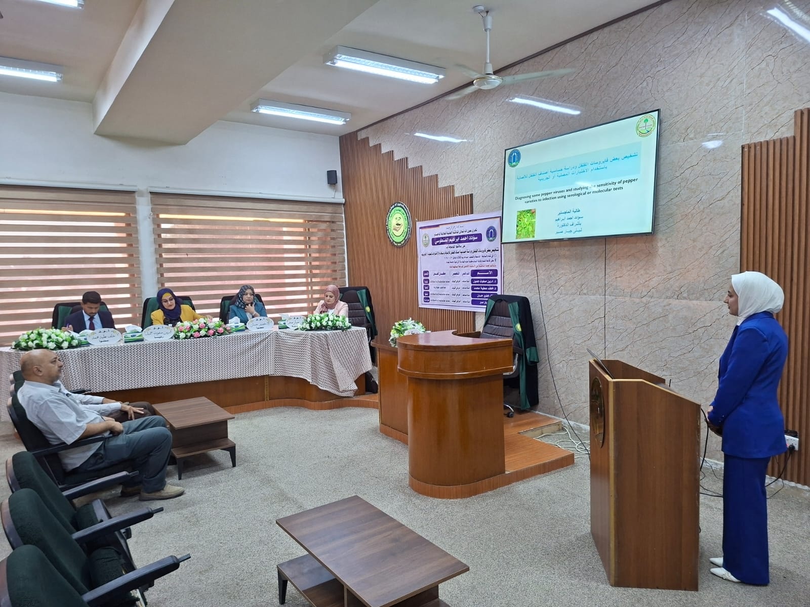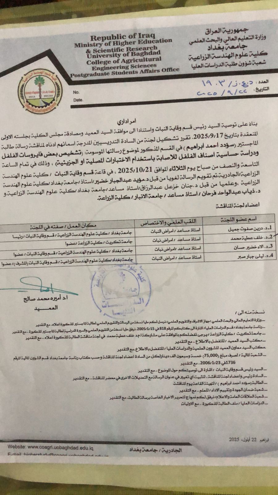 شارك الاستاذ المساعد الدكتور خلف عطية محمد بعضوية لجنة مناقشة رسالة ماجستير في كلية علوم الهندسة الزراعية جامعة بغداد مناقشة للطالبة سؤدد أحمد إبراهيم وبعنوان ( تشخيص بعض فايروسات الفلفل ودراسة حساسية اصناف الفلفل للإصابة بإستخدام الإختبارات المصلية أو الجزيئية)