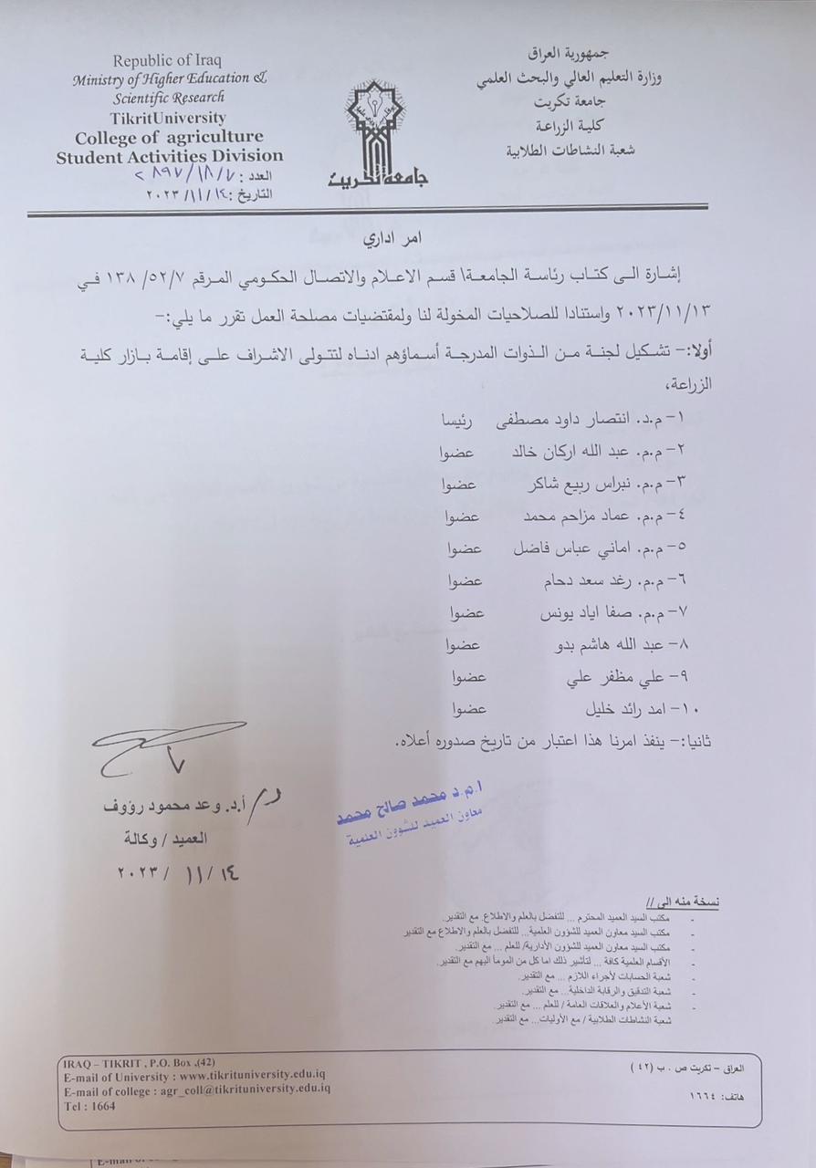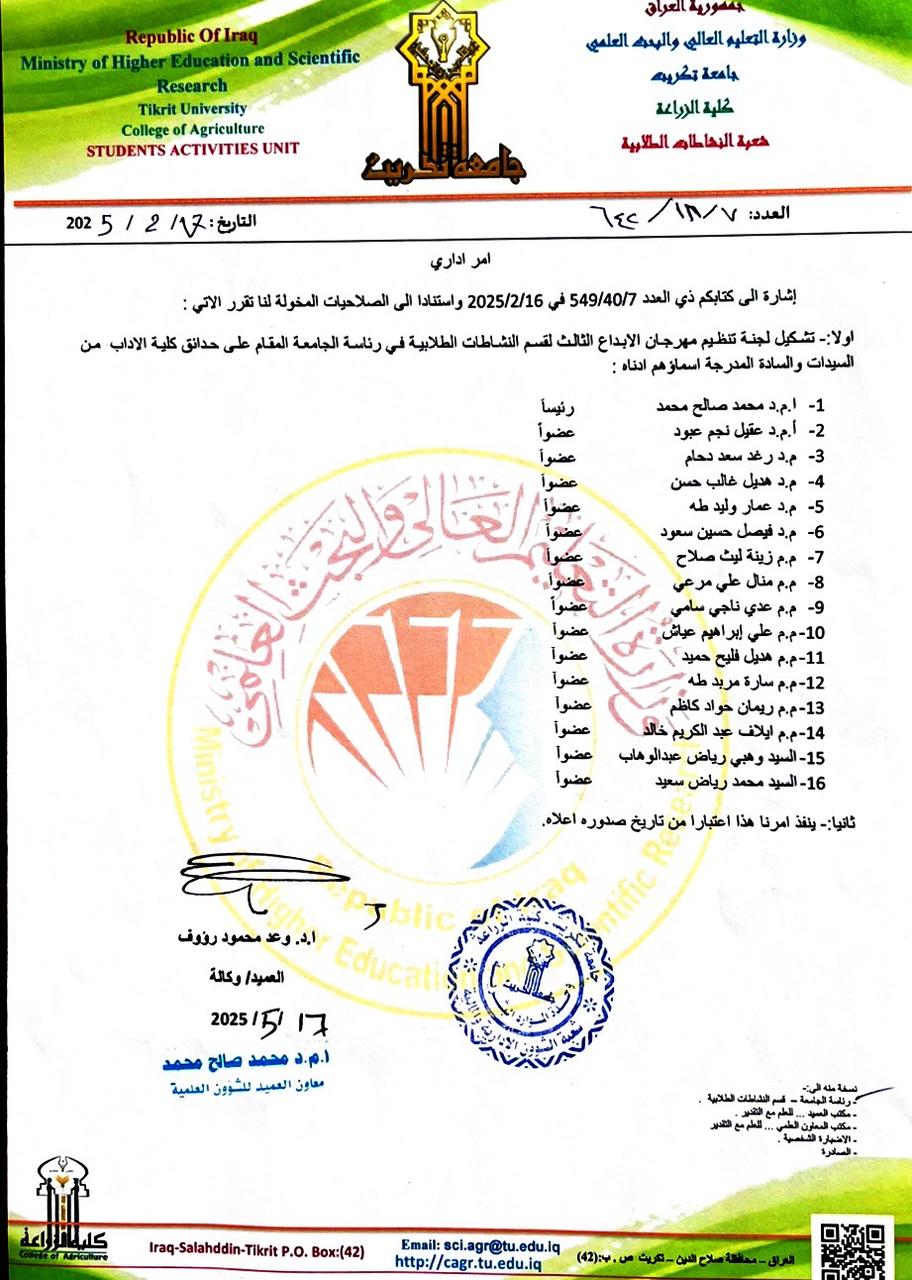 برعاية السيد رئيس جامعة تكريت وبإشراف السيد معاون العميد للشؤون العلمية الاستاذ المساعد الدكتور محمد صالح محمد.. نظمت كلية الزراعة مهرجان التمور السنوي، حيث يهدف المهرجان إلى تسليط الضوء على أهمية شجرة النخيل ومنتجاتها في الاقتصاد العراقي، بالإضافة إلى عرض أحدث التطورات في زراعة وإنتاج التمور.