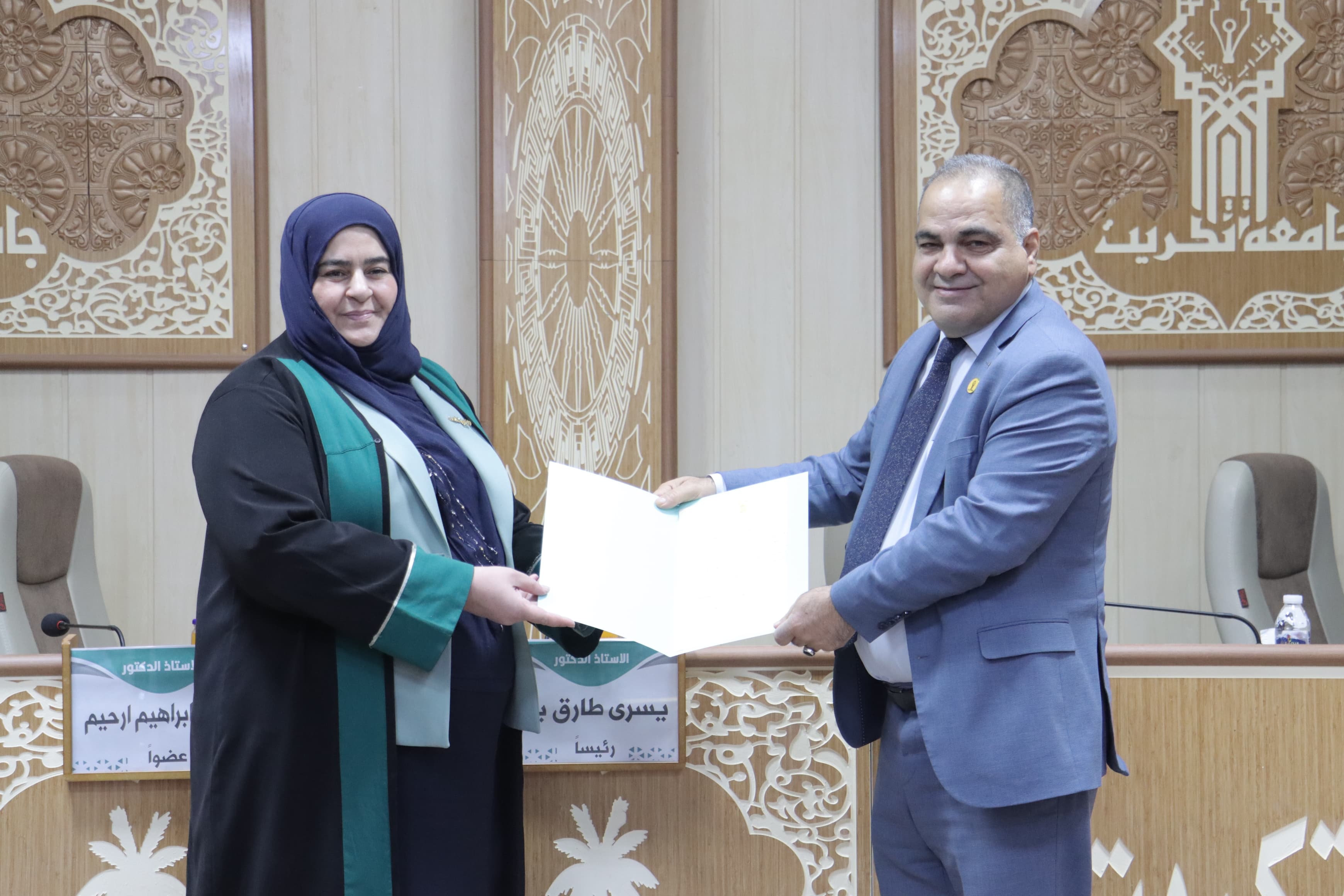 بحضور مساعد رئيس الجامعة للشؤون العلمية الأستاذ الدكتور حسن إبراهيم حسين والسيد عميد كلية الزراعة الأستاذ المساعد الدكتور سامي خضر سعيد.. نوقشت في قسم الاقتصاد والإرشاد الزراعي أطروحة دكتوراه للباحثة دعاء قاسم صبري بعنوان (السياسات المائية التركية وأثرها على التنمية الاقتصادية الزراعية في العراق للمدة 1990-2022).