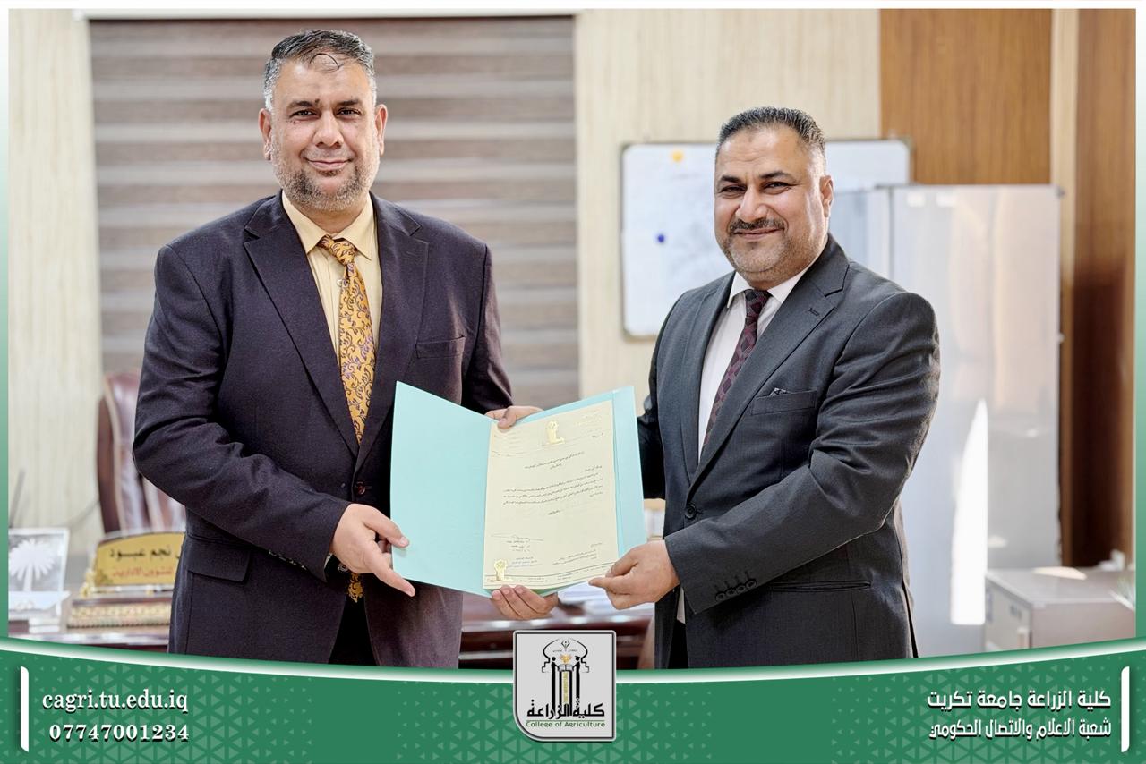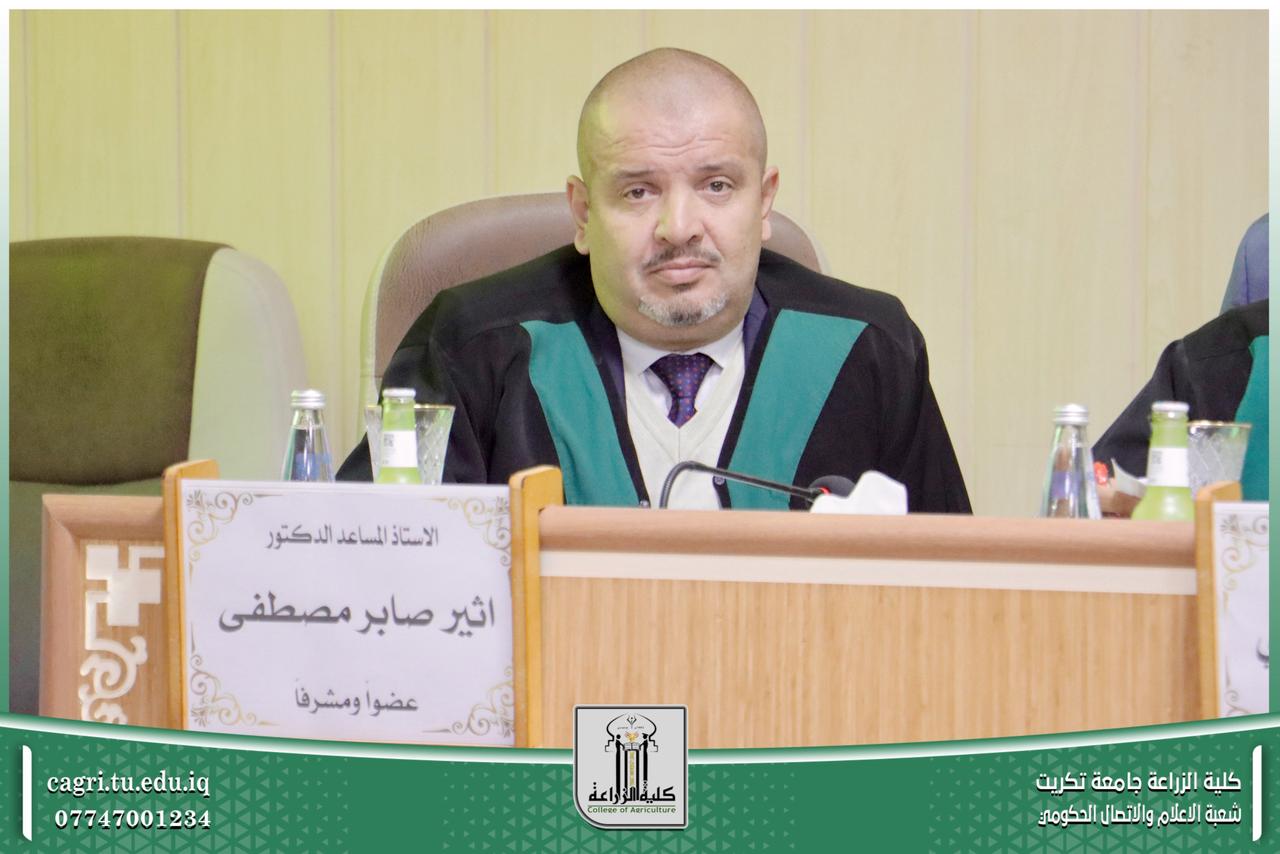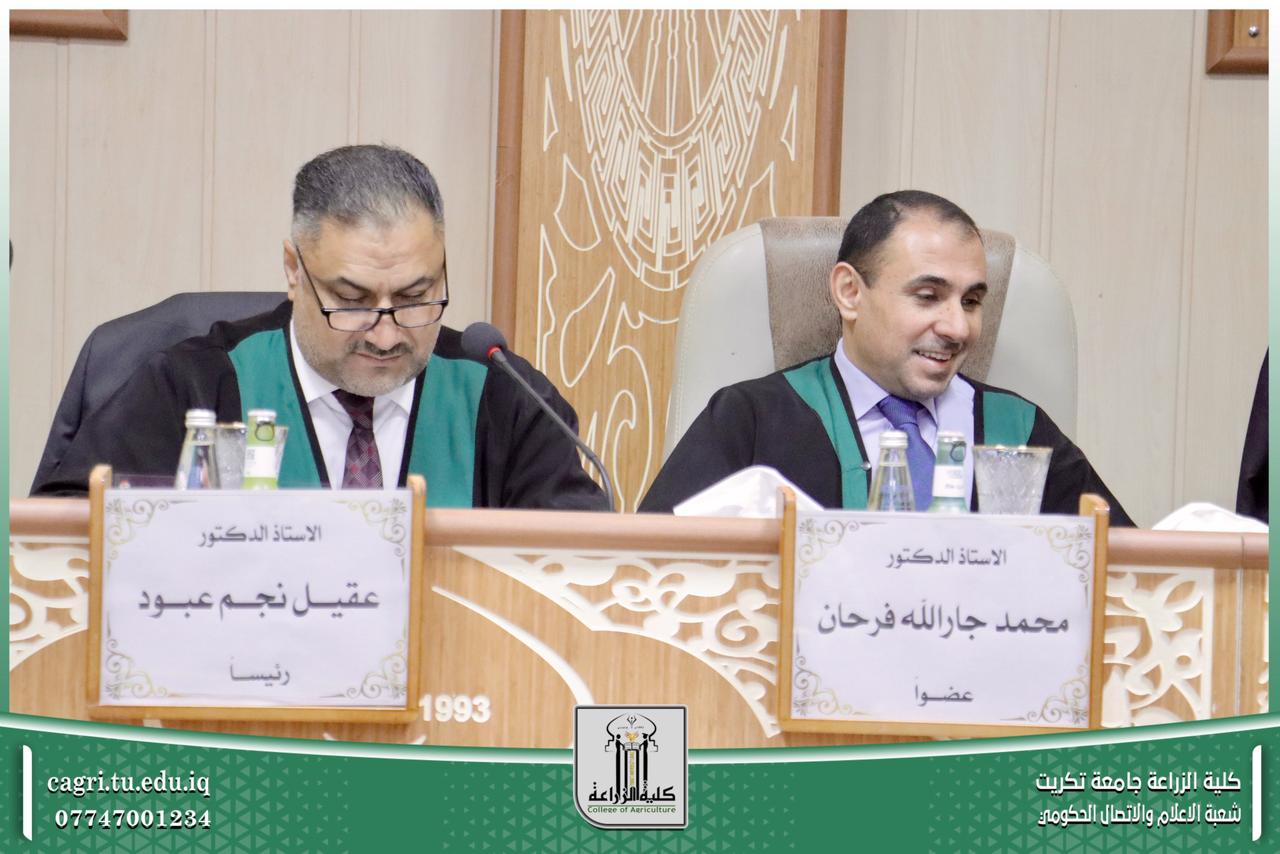 وتألفت لجنة المناقشة من نخبة من أساتذة كليتي الزراعة في جامعتي تكريت والأنبار، برئاسة الأستاذ الدكتور عقيل نجم عبود، وعضوية كل من الأساتذة مؤيد هادي إسماعيل، محمد جارالله فرحان، حسين علي مهدي، مظفر إسماعيل هويدي، إضافة إلى المشرفين وائل مصطفى جاسم ومنذر صابر مصطفى.
