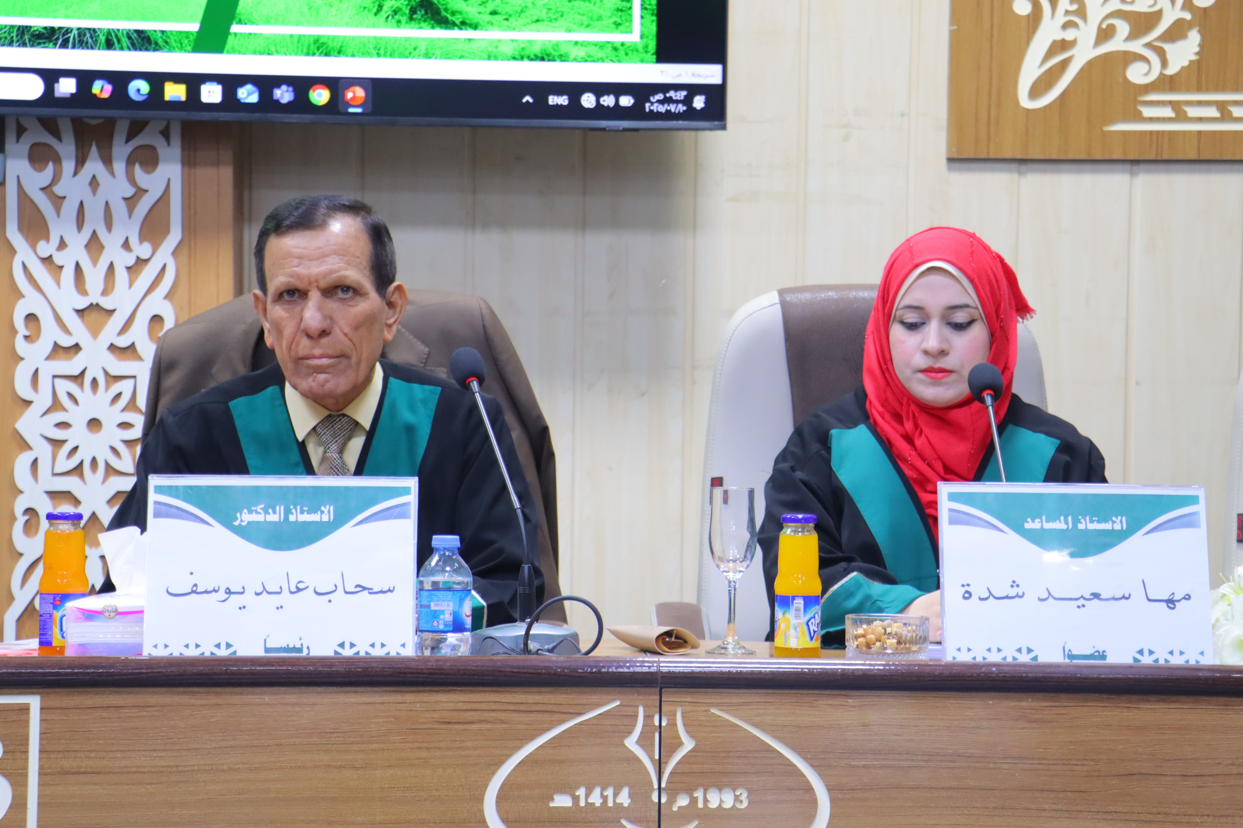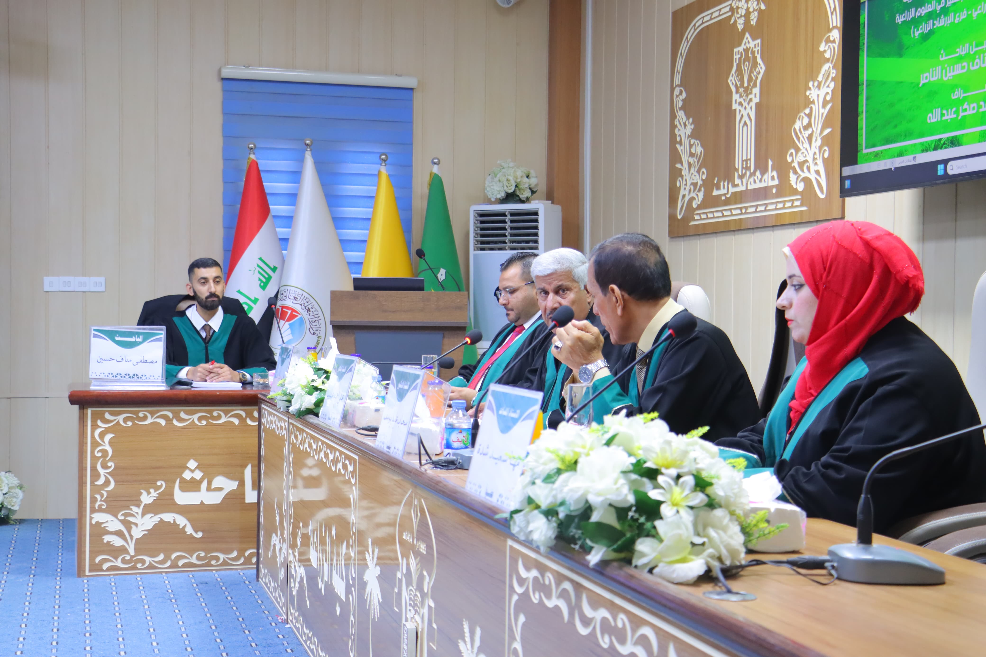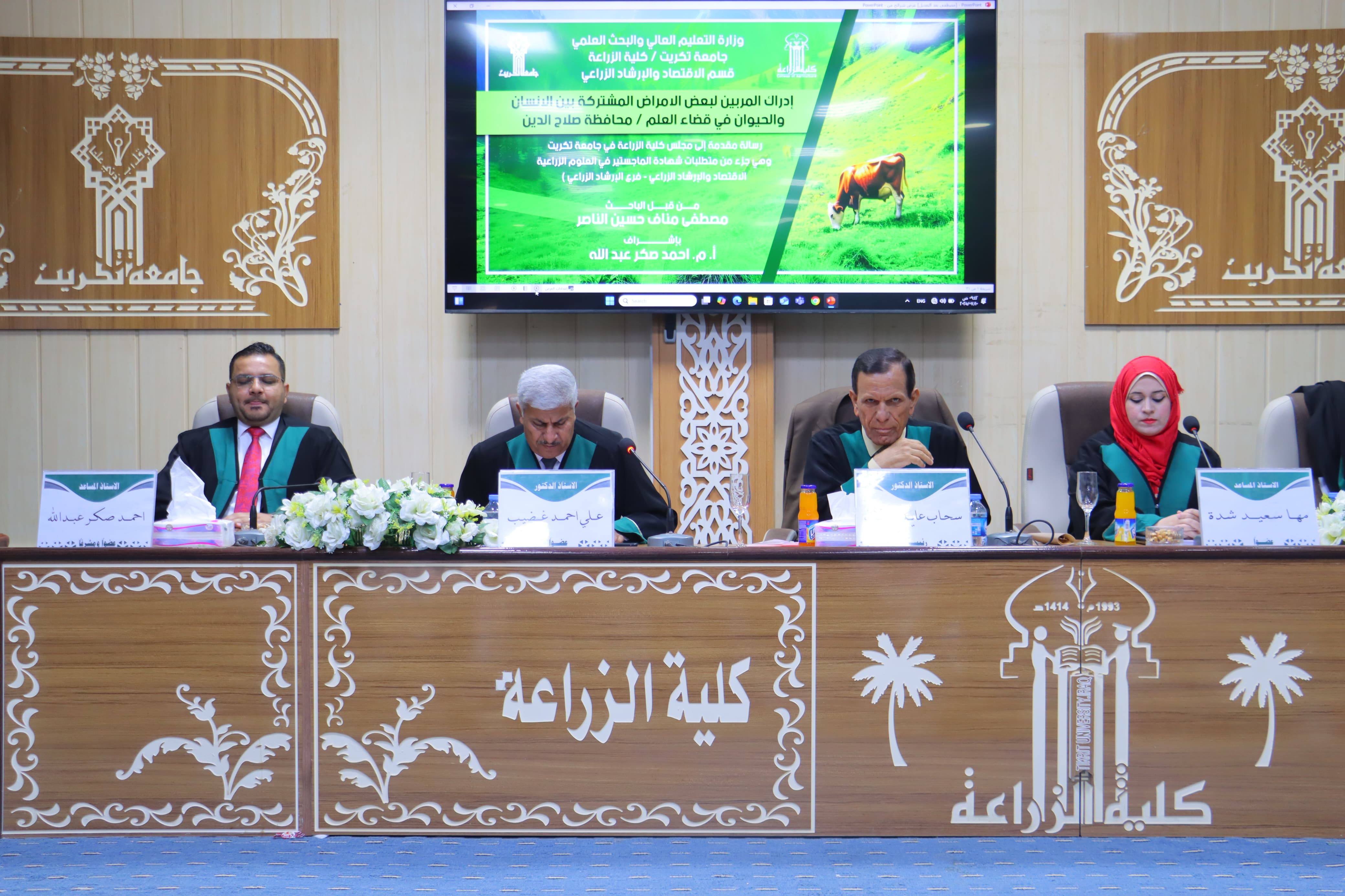 بحضور السيد العميد الاستاذ المساعد الدكتور سامي خضر سعيد.. نوقشت في قسم الاقتصاد والإرشاد الزراعي بكلية الزراعة - جامعة تكريت رسالة ماجستير للطالب مصطفى مناف حسين بعنوان (ادراك المربين لبعض الامراض المشتركة بين الانسان والحيوان في قضاء العلم/ محافظة صلاح الدين)