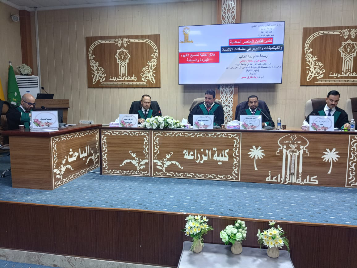 نوقشت في قسم علوم الأغذية بكلية الزراعة - جامعة تكريت رسالة ماجستير للطالب ياسين فوزي حمدان بعنوان (تقدير فقدان العناصر المعدنية والفيتامينات والتغير في مضادات الأكسدة خلال عملية تصنيع القهوة الباردة والساخنة)