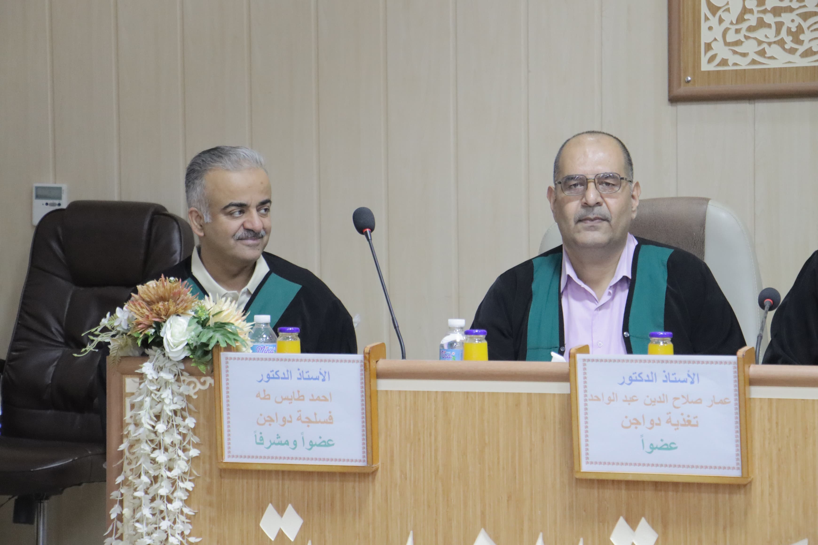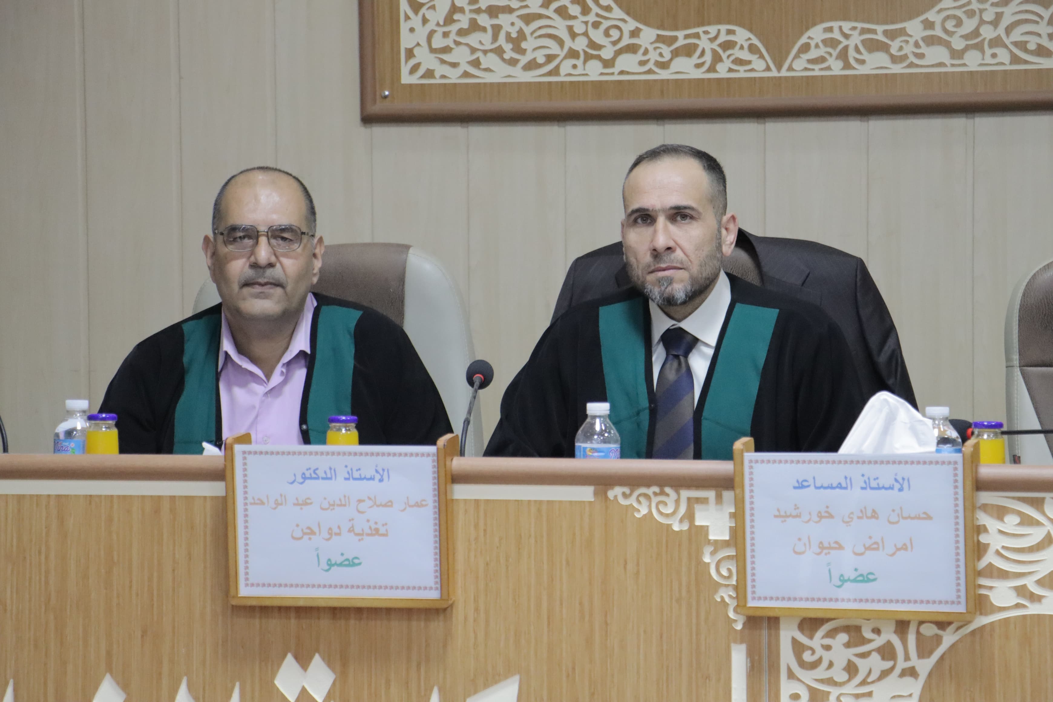 بحضور عميد كلية الزراعة الاستاذ المساعد الدكتور سامي خضر سعيد.. نوقشت في قسم الانتاج الحيواني أطروحة دكتوراه للباحث معاذ وعد عكله بعنوان (تأثير بكتيريا Lactobacillus fermentum وLactobacillus plantarum في الأداء الإنتاجي والفسلجي لفروج اللحم المغذى على عليقة ملوثة بسم الافلاتوكسينB1)