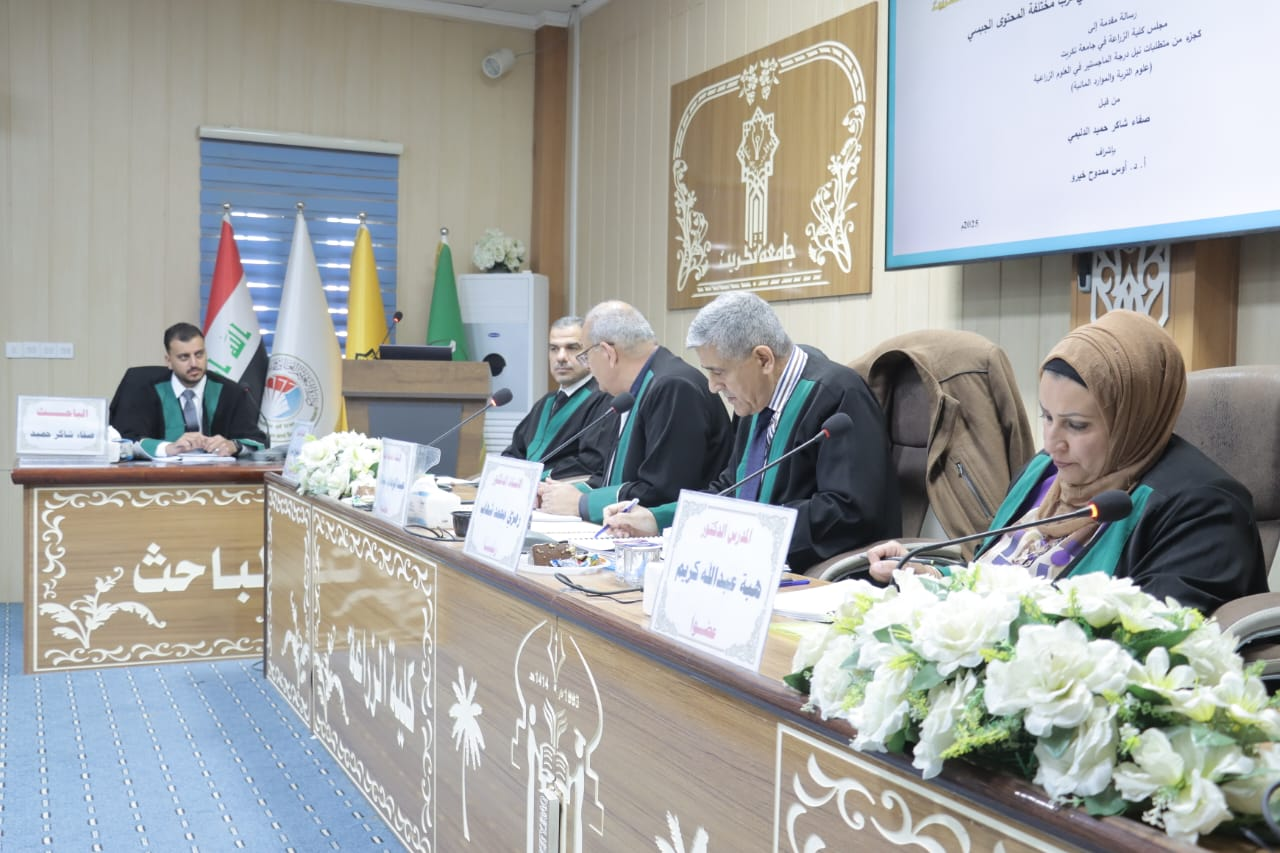 نوقشت في قسم التربة والموارد المائية بكلية الزراعة - جامعة تكريت مناقشة رسالة ماجستير للطالب صفاء شاكر حميد بعنوان (اختبار بعض معادلات تقدير غيض الماء في ترب مختلفة المحتوى الجبسي).. وتألفت لجنة المناقشة من: