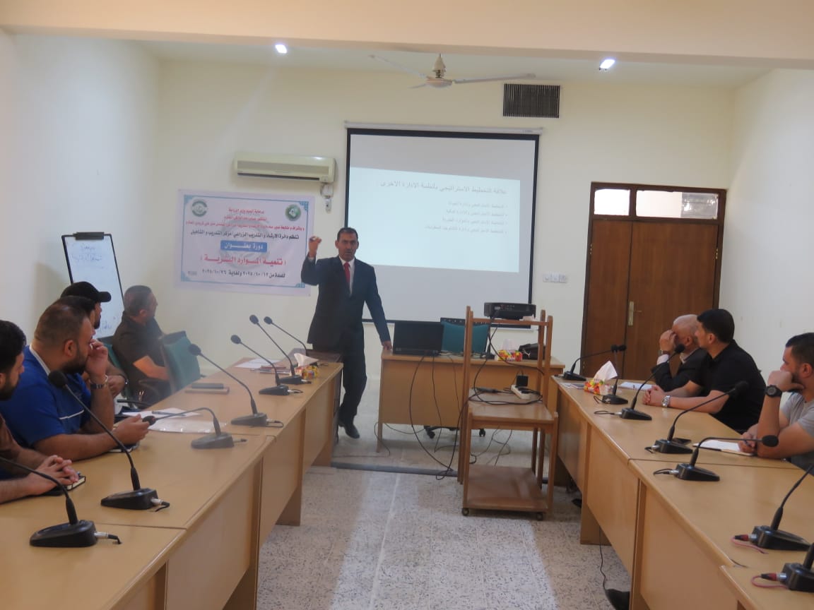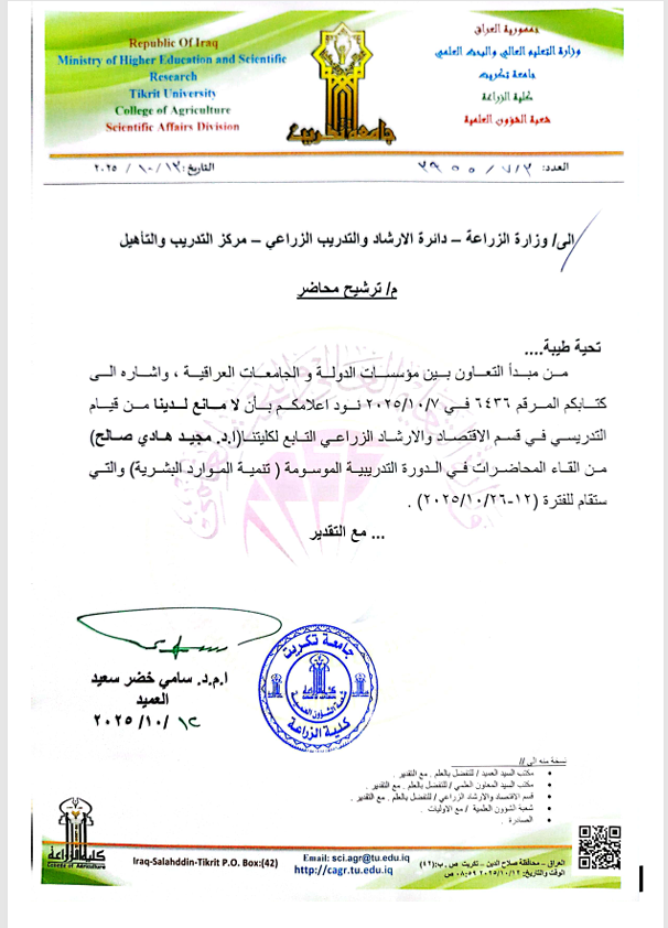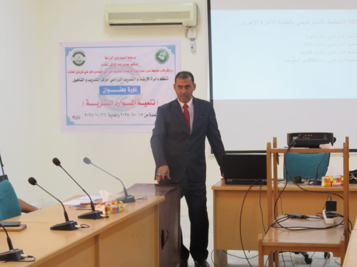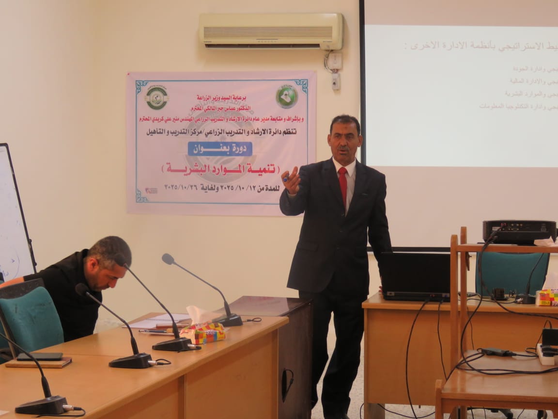 بتوجيه ومتابعة مباشرة من السيد العميد الأستاذ المساعد الدكتور سامي خضر سعيد، ومن منطلق تعزيز التعاون بين مؤسسات الدولة والجامعات العراقية، شارك التدريسي في قسم الاقتصاد والإرشاد الزراعي بكلية الزراعة الأستاذ الدكتور مجيد هادي صالح في تقديم مجموعة من المحاضرات العلمية ضمن الدورة التدريبية الموسومة "تنمية الموارد البشرية"، التي أقيمت في وزارة الزراعة – دائرة الإرشاد والتدريب الزراعي – مركز التدريب والتأهيل للفترة من 16 إلى 20 حزيران 2025.