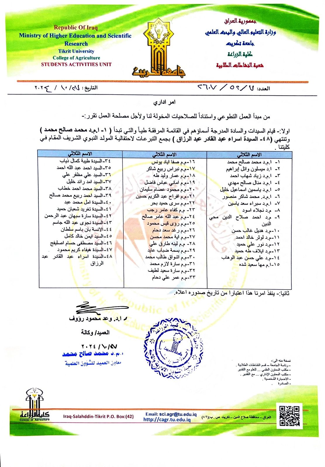 وضمن فعاليات شعبة النشاطات الطلابية في كليتنا و بحضور كل من السيد مساعد رئيس الجامعة للشؤون الادارية الاستاذ الدكتور حسين عبد اسماعيل والاستاذ الدكتور ابتسام حيدر بكتاش مسؤول قسم النشاطات الطلابية في رئاسة الجامعة أقامت الكلية متمثلةً بالسيد معاون العميد للشؤون العلمية الاستاذ المساعد الدكتور محمد صالح محمد احتفاليةً بمناسبة مولد سيد الكائنات محمد صلى الله عليه وسلم، كما حضر الحفلَ ثلة من تدريسيي الكلية وجمع وافر من طلبتها الأعزاء.