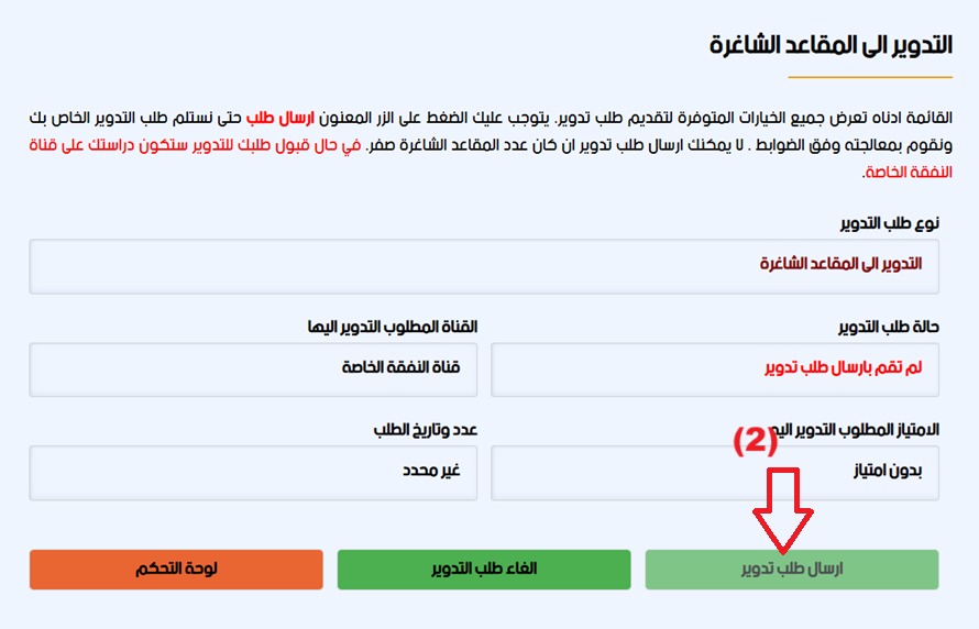 - يسقط حق المتقدم من المنافسة على مقاعد النفقة الخاصة الشاغرة في حال عدم ارسال طلب الكتروني ضمن التوقيتات المحددة من قبل الوزارة.