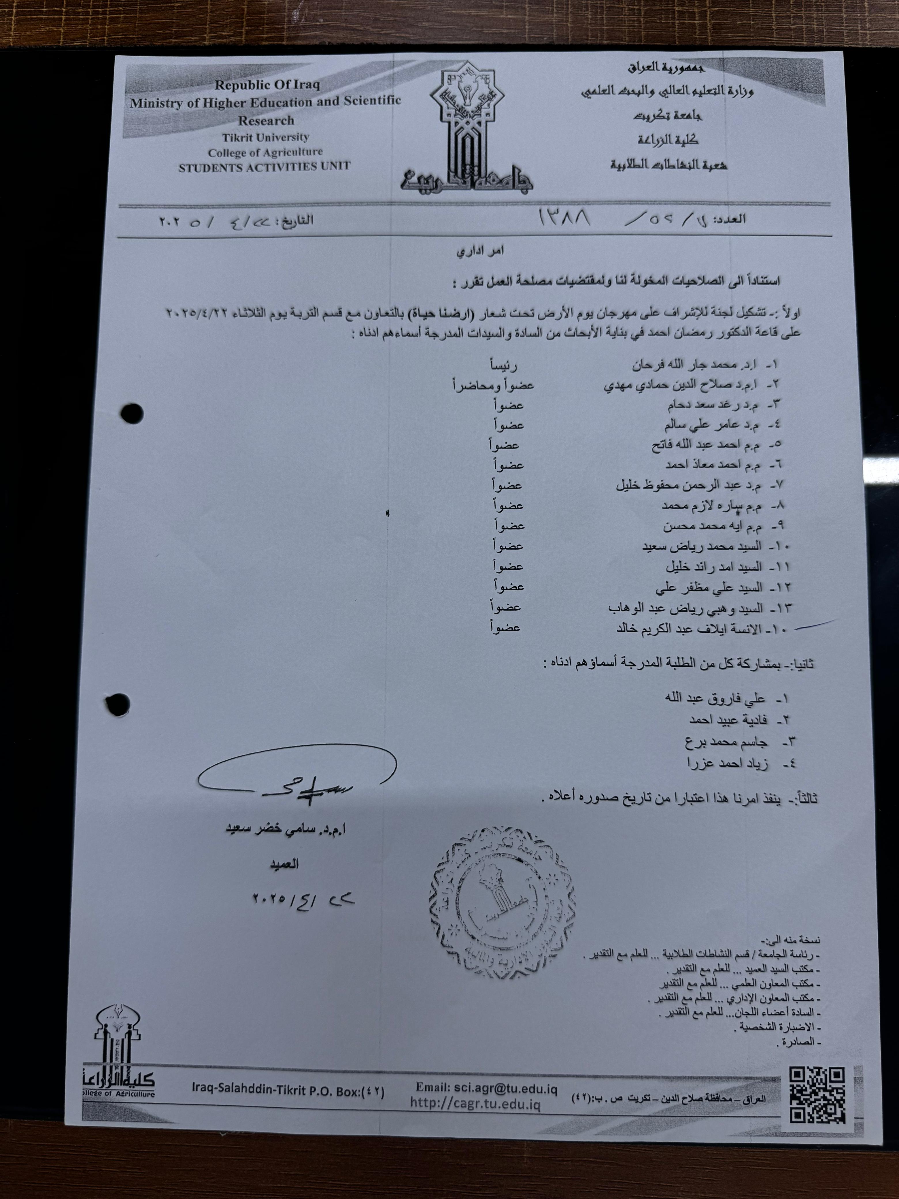 برعاية السيد رئيس جامعة تكريت الأستاذ الدكتور وعد محمود رؤوف، وبإشراف السيد عميد كلية الزراعة الأستاذ المساعد الدكتور سامي خضر سعيد.. أقامت شعبة النشاطات الطلابية بالتعاون مع قسم التربة والموارد المائية مهرجانا بمناسبة يوم الأرض تحت عنوان: