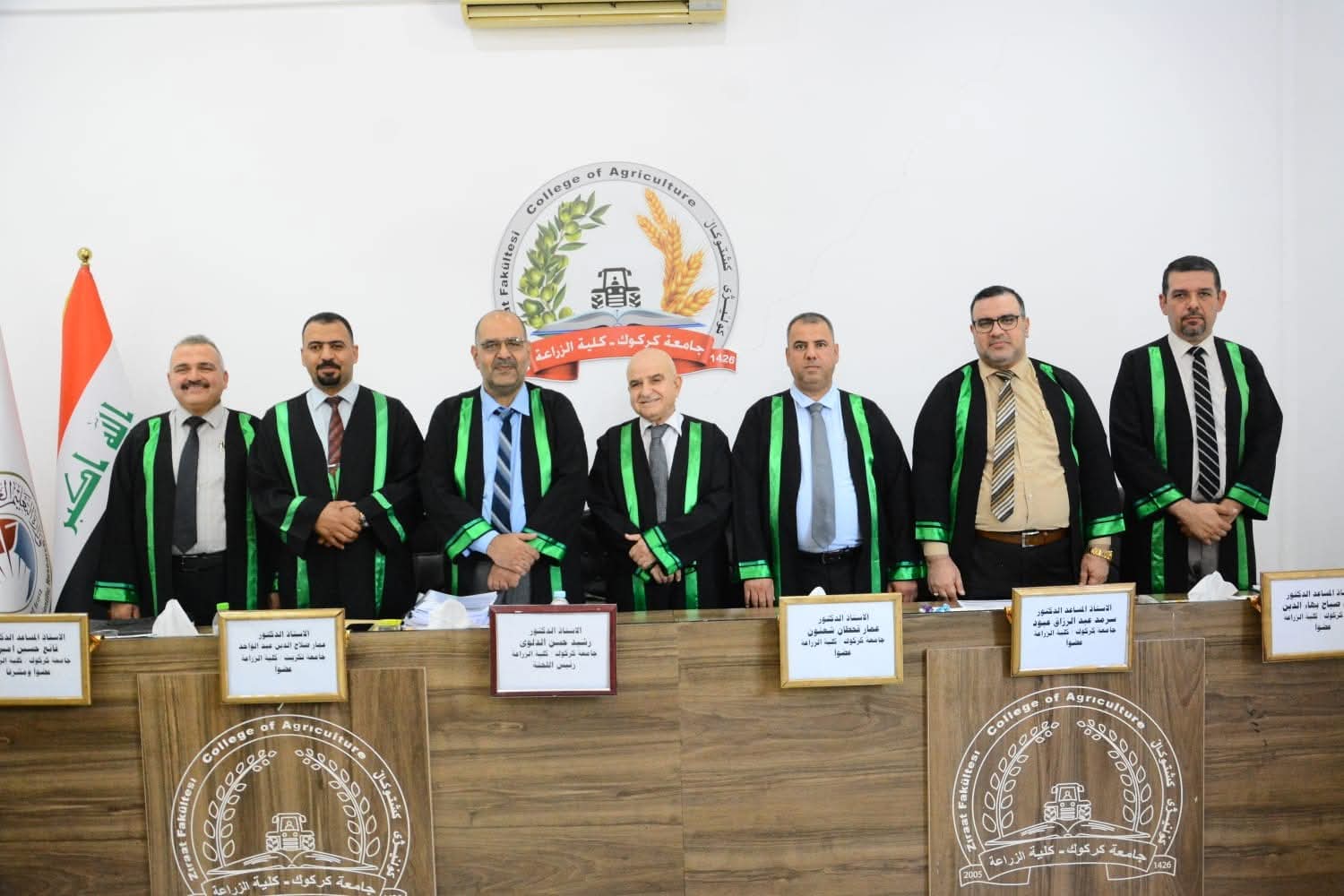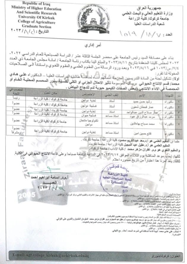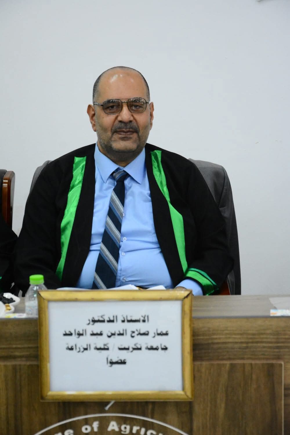 شارك التدريسي في قسم الانتاج الحيواني بكلية الزراعة - جامعة تكريت الاستاذ الدكتور عمار صلاح الدين عبد الواحد بمناقشة أطروحة دكتوراه بكلية الزراعة - جامعة كركوك للباحث علي هادي محمد قسم من الانتاج الحيواني بعنوان (تأثير الاحلال الجزئي أو الكلي لكسبة بذور السمسم المحلية الخام أو المحمصة في الاداء الانتاجي وبعض الصفات الكيميو حيوية لدم للدجاج البياض)
