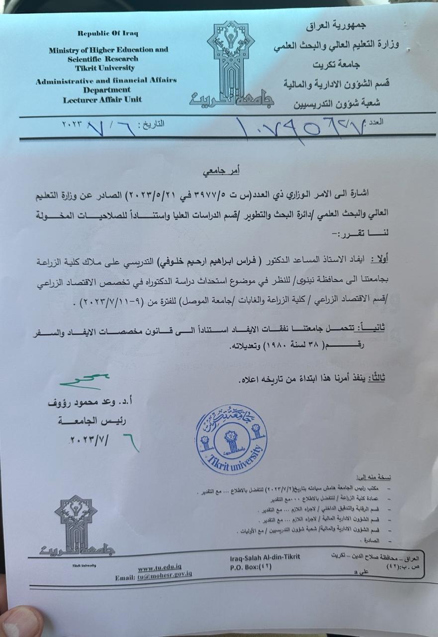 شارك التدريسي الاستاذ المساعد الدكتور فراس ابراهيم ارحيم كعضو لجنة لاستحداث قسم الاقتصاد والارشاد الزراعي في كلية الزراعة والغابات بجامعة الموصل وفق أمر وزاري وآخر جامعي صادر في 6-7-2023