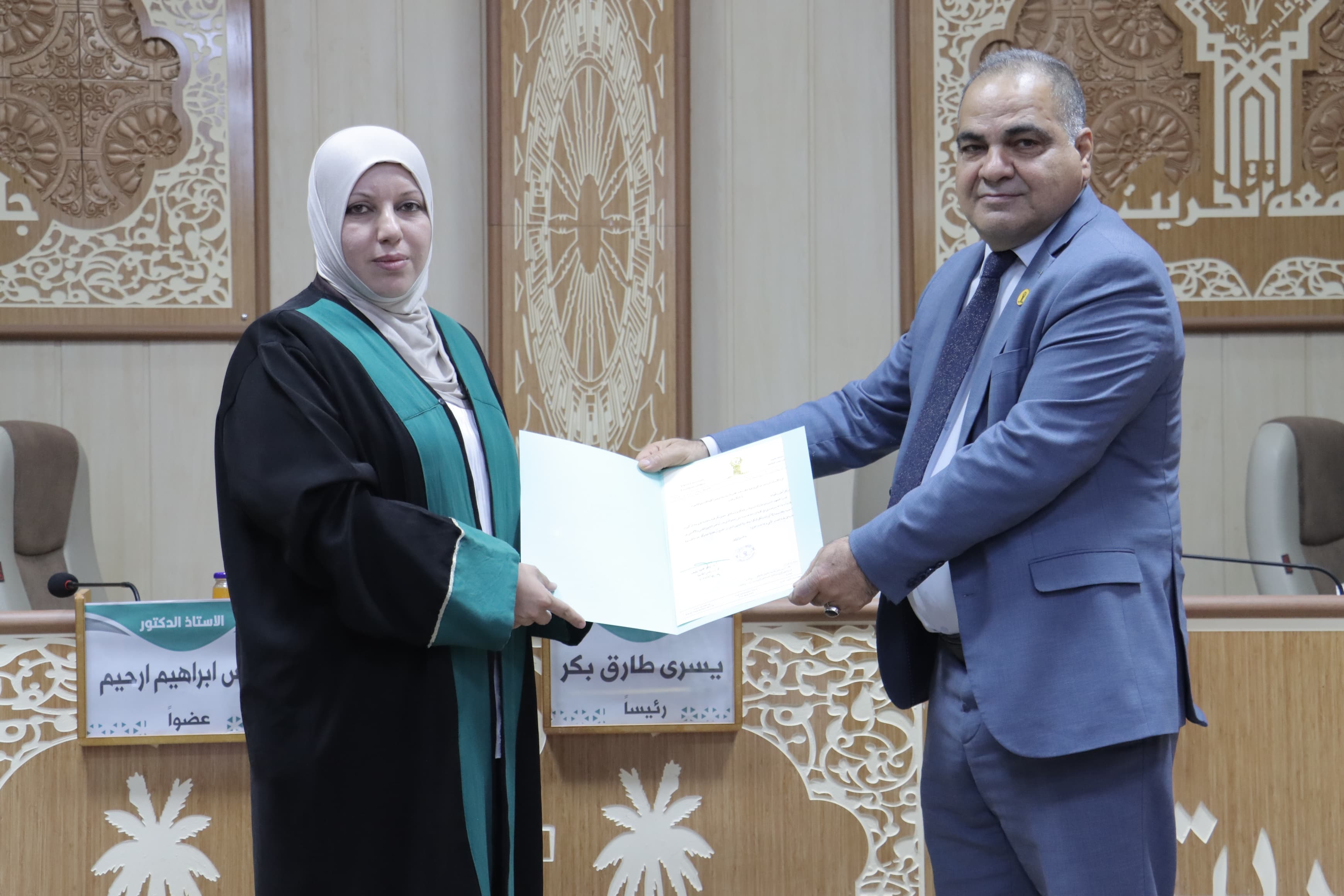 بحضور مساعد رئيس الجامعة للشؤون العلمية الأستاذ الدكتور حسن إبراهيم حسين والسيد عميد كلية الزراعة الأستاذ المساعد الدكتور سامي خضر سعيد.. نوقشت في قسم الاقتصاد والإرشاد الزراعي أطروحة دكتوراه للباحثة دعاء قاسم صبري بعنوان (السياسات المائية التركية وأثرها على التنمية الاقتصادية الزراعية في العراق للمدة 1990-2022).