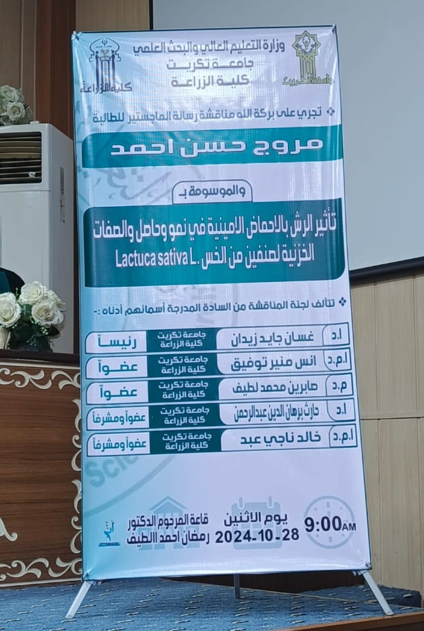 نوقشت في كلية الزراعة قسم البستنة وهندسة الحدائق رسالة ماجستير للباحثة (مروج حسن أحمد عبطان) بعنوان (تأثير الرش بالاحماض الامينية في نمو وحاصل والصفات الخزنية لصنفين من الخس .Lactucasativa L) وحصلت على تقدير امتياز