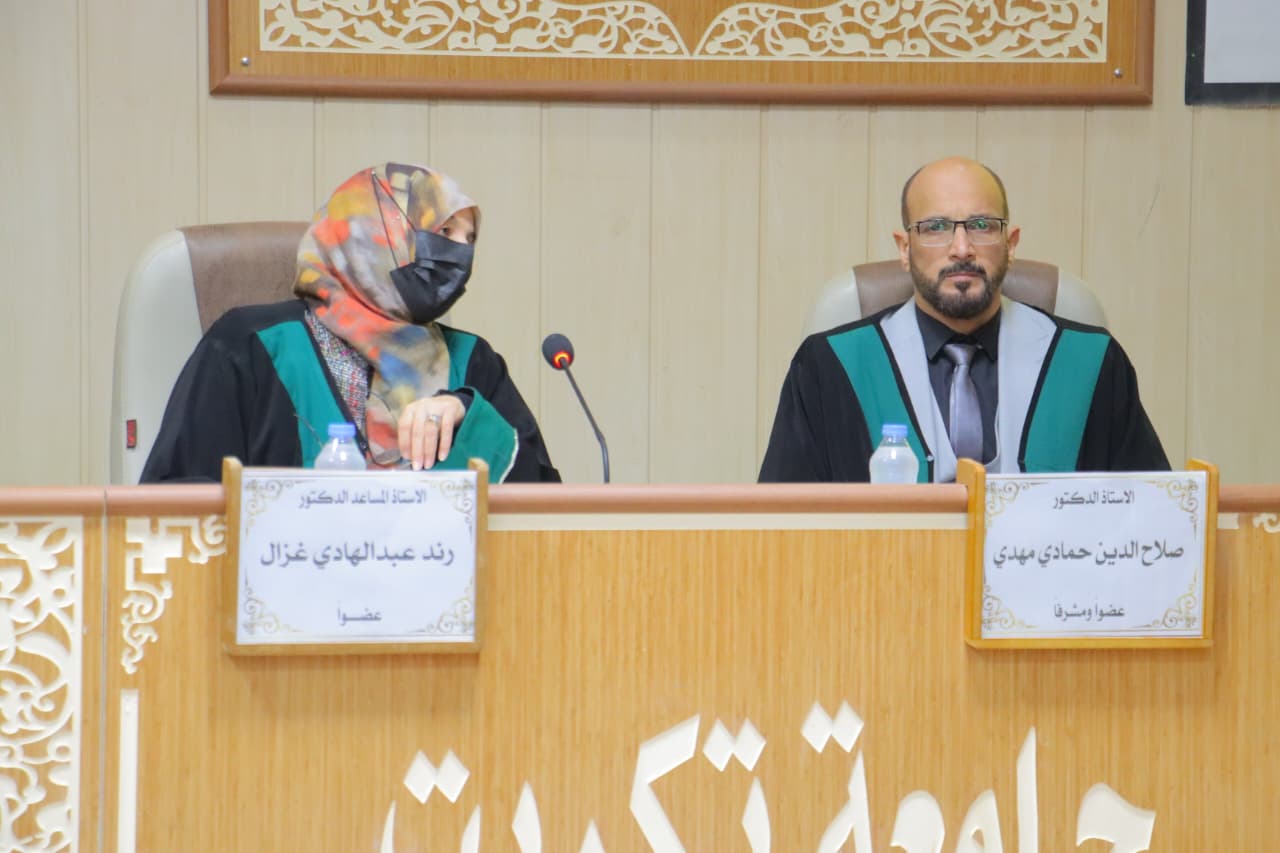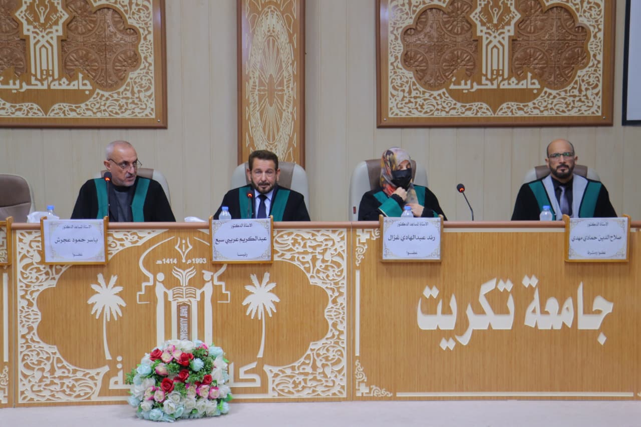 وتألفت لجنة المناقشة من الأستاذ الدكتور عبدالكريم عريبي سبع رئيساً، وعضوية كل من الأستاذ المساعد الدكتور رند عبد الهادي غزال من جامعة الموصل/ كلية الزراعة والغابات، والأستاذ المساعد الدكتور ياسر حمود عريش من جامعة تكريت/ كلية الزراعة، فيما شارك الأستاذ الدكتور صالح الدين حمادي مهدي من جامعة تكريت/ كلية الزراعة عضواً ومشرفاً.