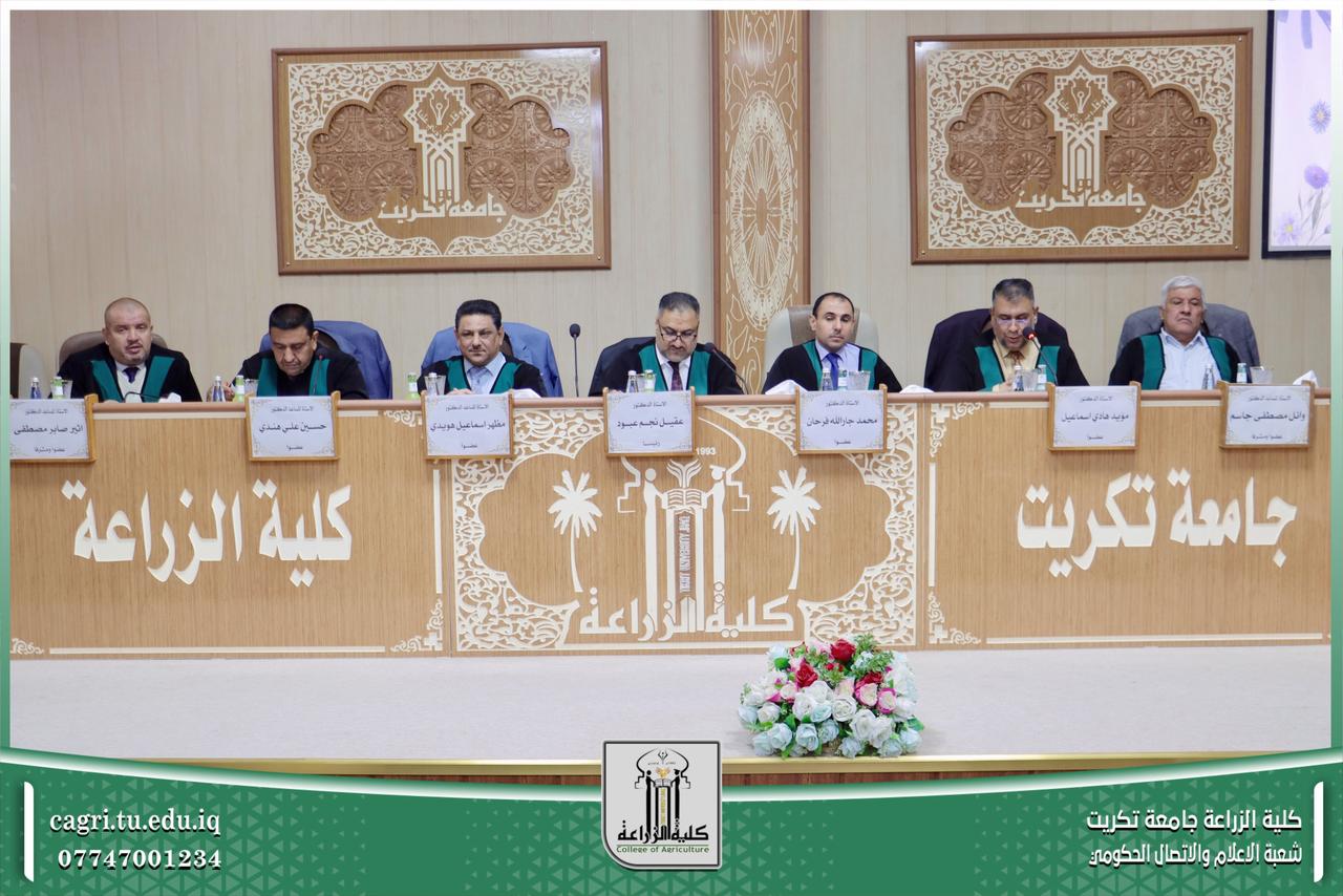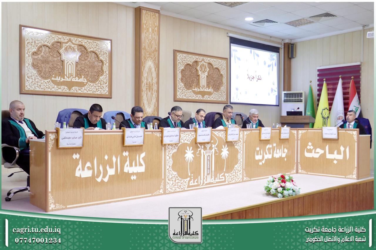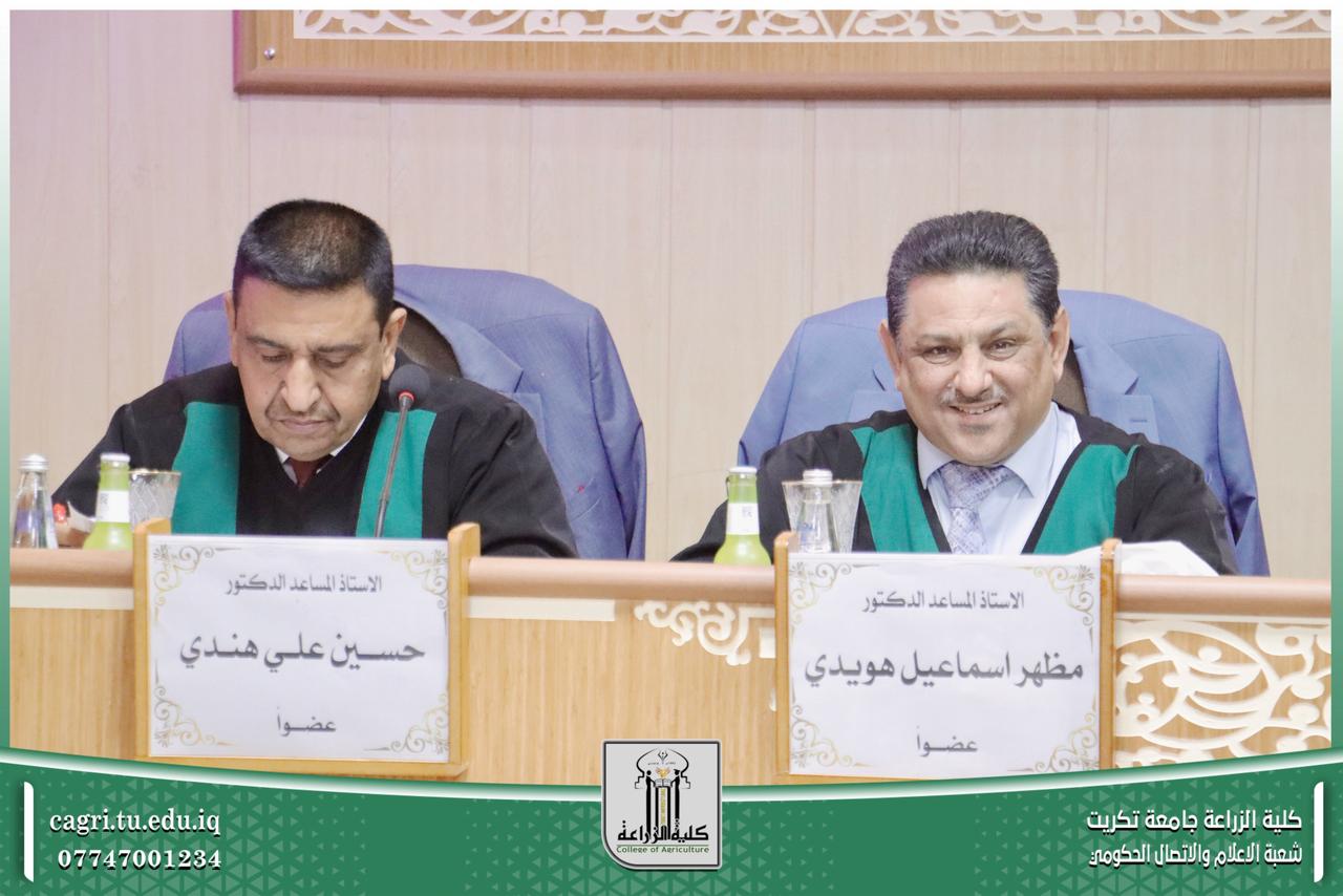 وتألفت لجنة المناقشة من نخبة من أساتذة كليتي الزراعة في جامعتي تكريت والأنبار، برئاسة الأستاذ الدكتور عقيل نجم عبود، وعضوية كل من الأساتذة مؤيد هادي إسماعيل، محمد جارالله فرحان، حسين علي مهدي، مظفر إسماعيل هويدي، إضافة إلى المشرفين وائل مصطفى جاسم ومنذر صابر مصطفى.