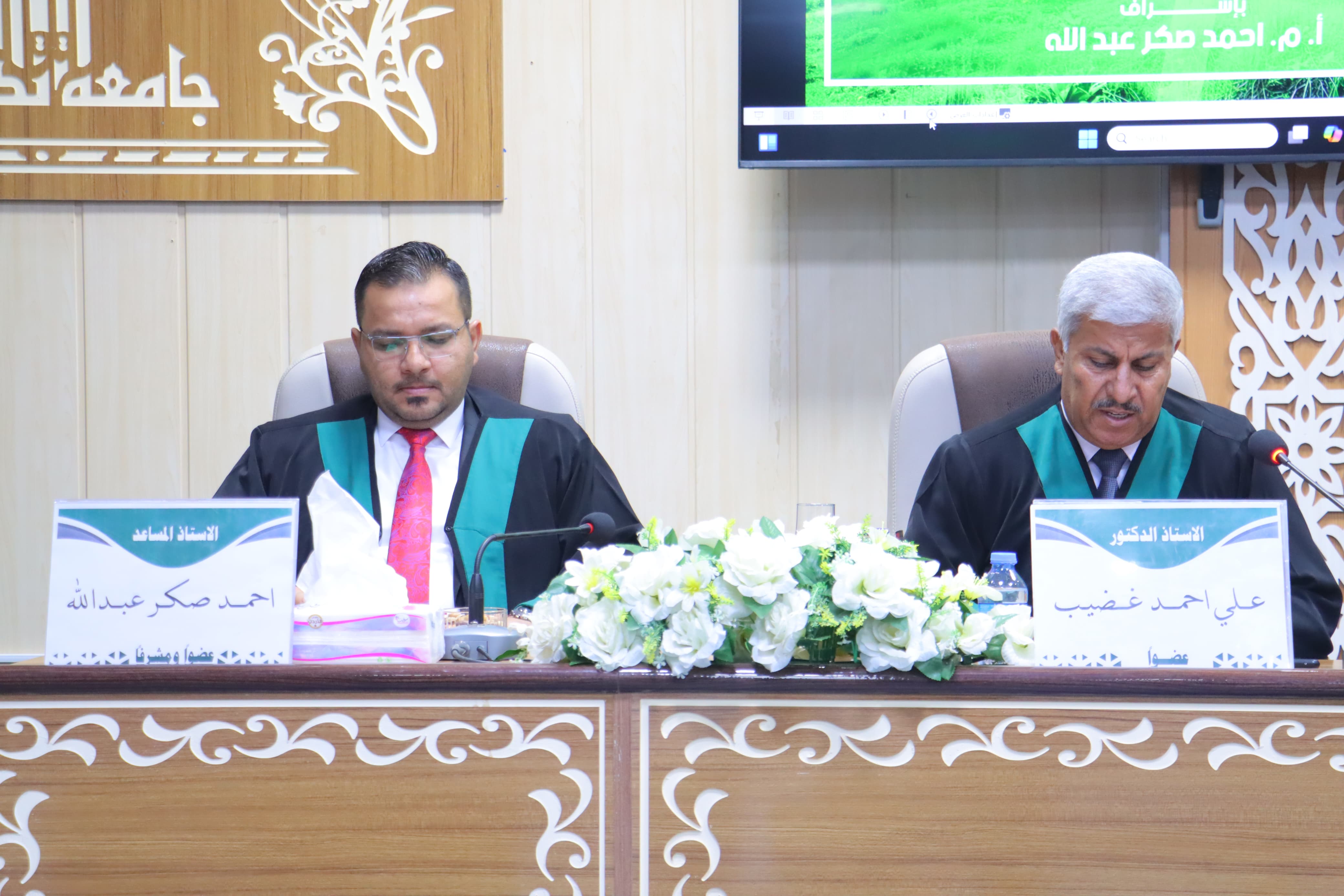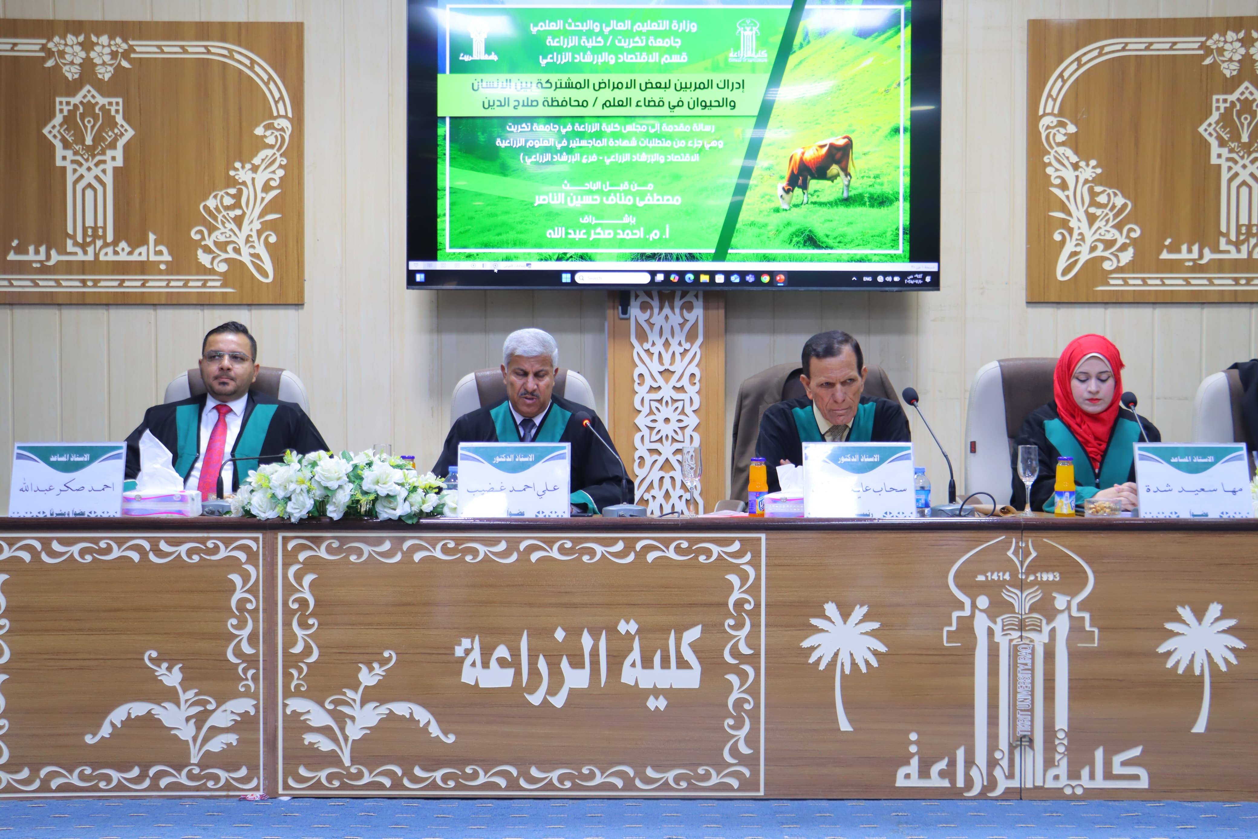 بحضور السيد العميد الاستاذ المساعد الدكتور سامي خضر سعيد.. نوقشت في قسم الاقتصاد والإرشاد الزراعي بكلية الزراعة - جامعة تكريت رسالة ماجستير للطالب مصطفى مناف حسين بعنوان (ادراك المربين لبعض الامراض المشتركة بين الانسان والحيوان في قضاء العلم/ محافظة صلاح الدين)