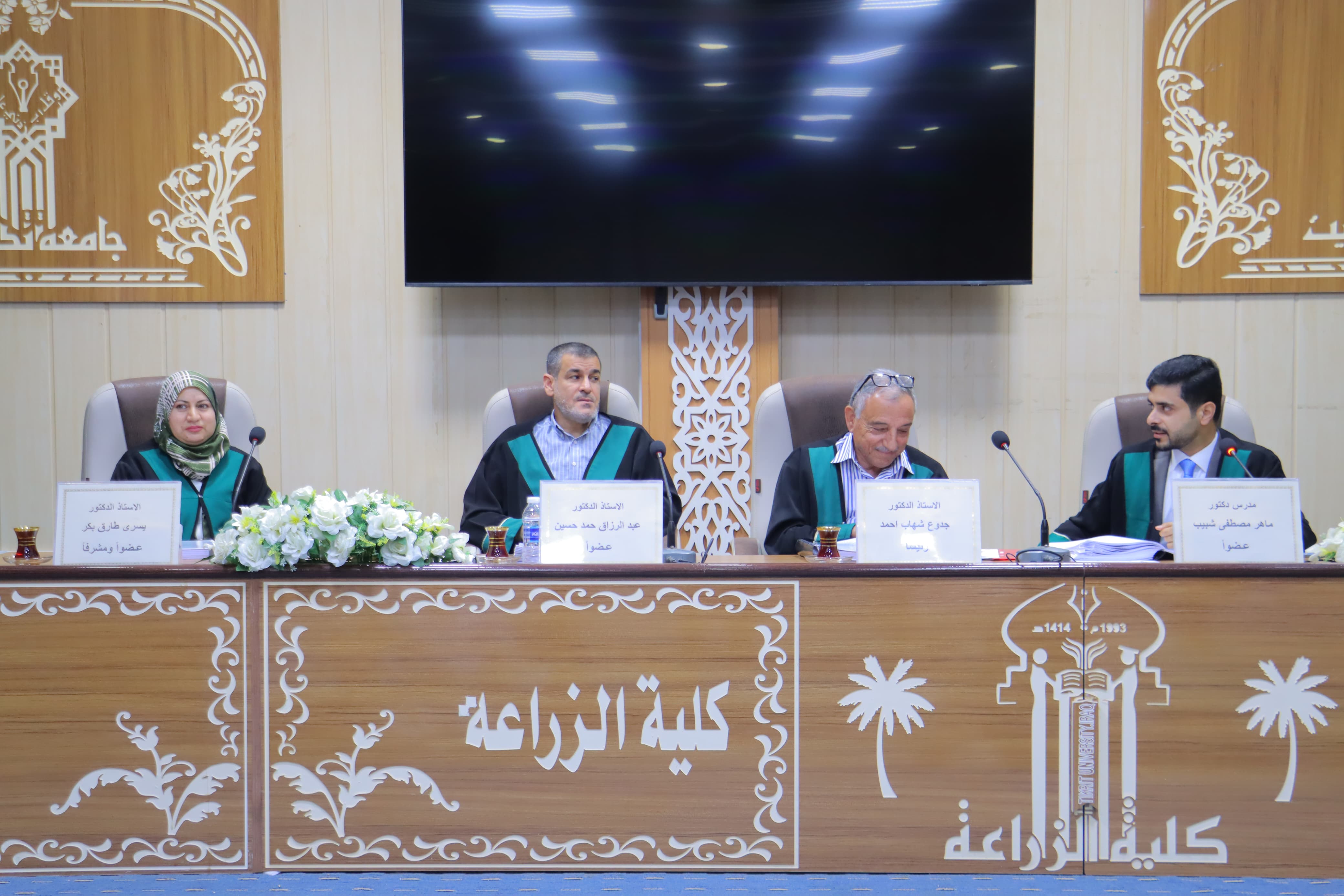 بحضور السيد العميد الاستاذ المساعد الدكتور سامي خضر سعيد.. نوقشت في قسم الاقتصاد والإرشاد الزراعي بكلية الزراعة - جامعة تكريت رسالة ماجستير للطالبة عائشة فؤاد عزيز بعنوان (دراسة اقتصادية لدوال تكاليف إنتاج التمور في محافظة صلاح الدين الموسم الزراعي 2024/ قضاء بلد انموذجاً تطبيقياً).