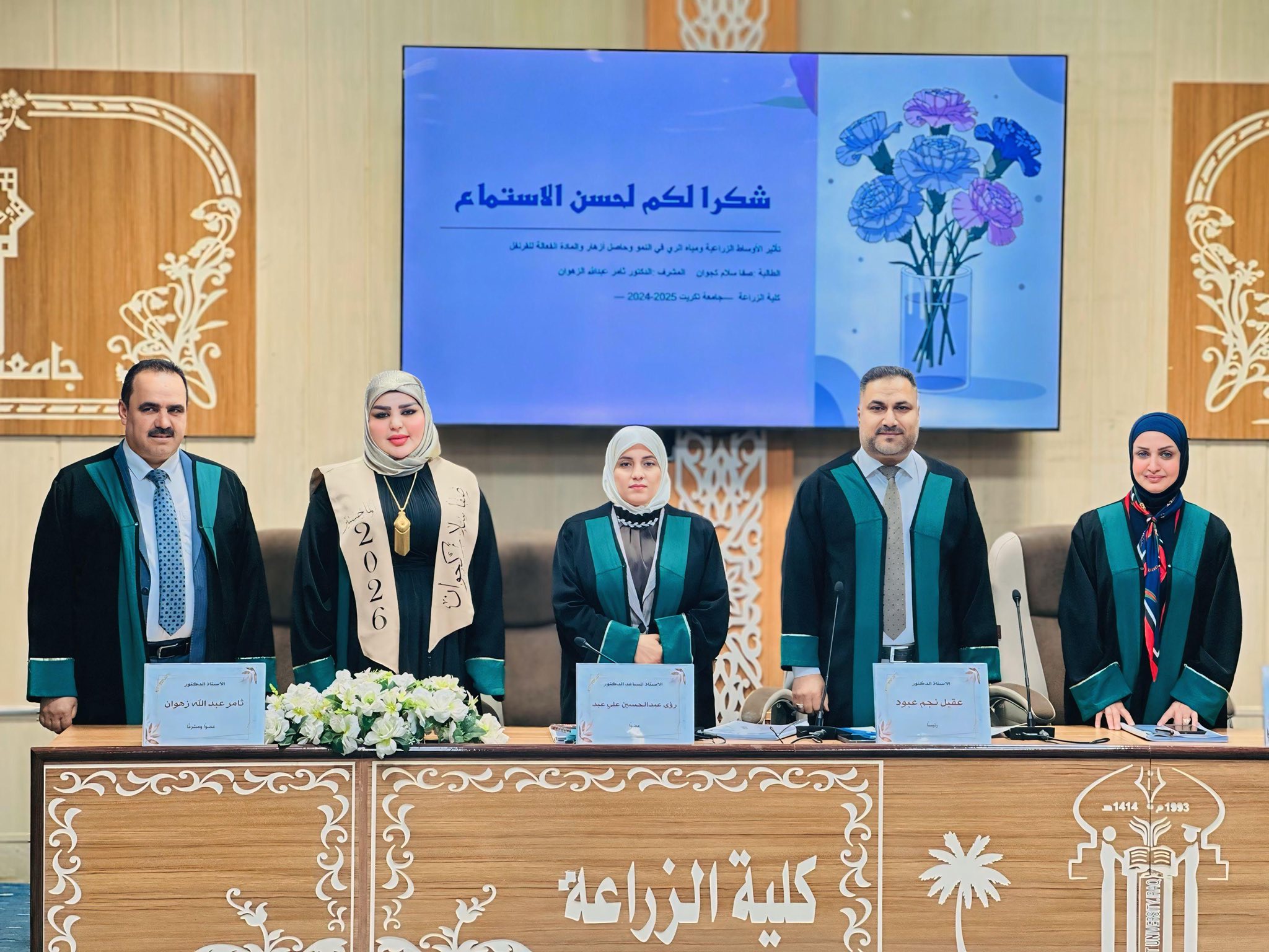 نوقشت في قسم البستنة وهندسة الحدائق بكلية الزراعة - جامعة تكريت رسالة ماجستير للطالبة صفا سلام كجوان نصيف بعنوان (تأثير الأوساط الزراعية ومياه الري في نمو وحاصل أزهار والمادة الفعالة للقرنفل)