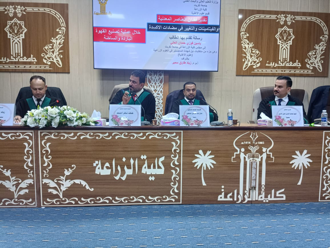 نوقشت في قسم علوم الأغذية بكلية الزراعة - جامعة تكريت رسالة ماجستير للطالب ياسين فوزي حمدان بعنوان (تقدير فقدان العناصر المعدنية والفيتامينات والتغير في مضادات الأكسدة خلال عملية تصنيع القهوة الباردة والساخنة)