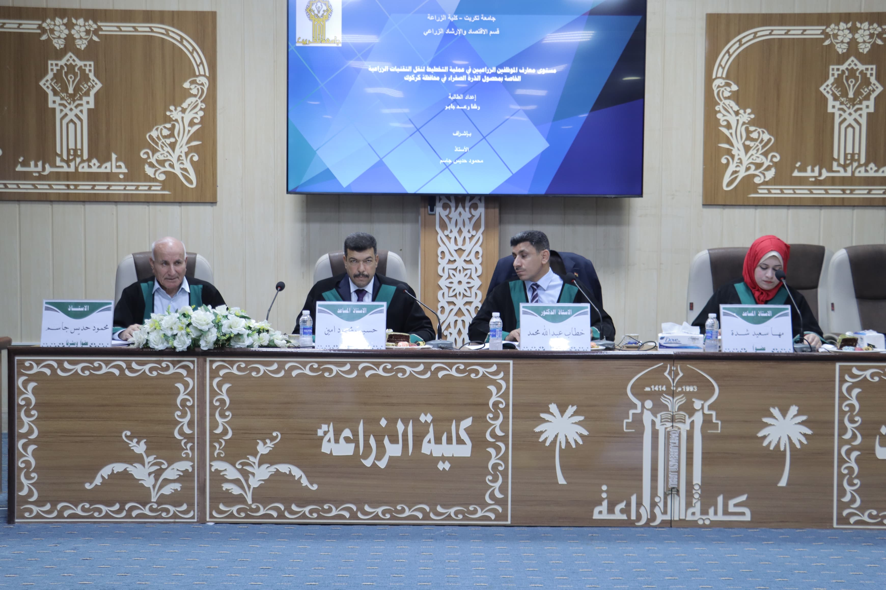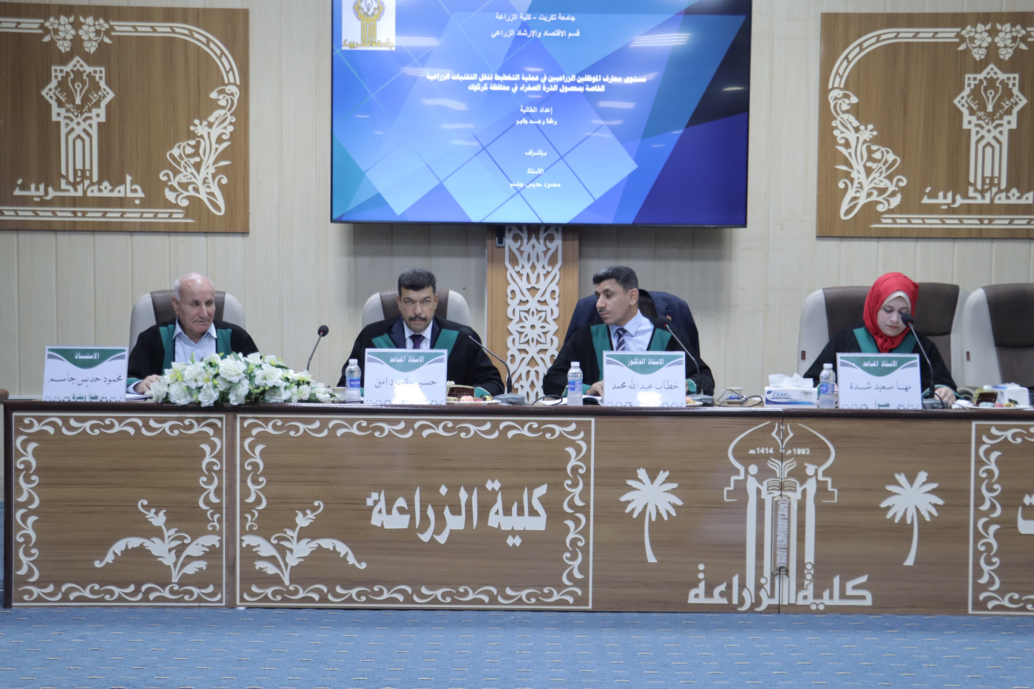 نوقشت في قسم الاقتصاد والارشاد الزراعي بكلية الزراعة - جامعة تكريت رسالة ماجستير للطالبة رشا رعد جابر بعنوان (مستوى معارف الموظفين الزراعيين في عملية التخطيط لنقل التقنيات الزراعية الخاصة بمحصول الذرة الصفراء في محافظة كركوك)