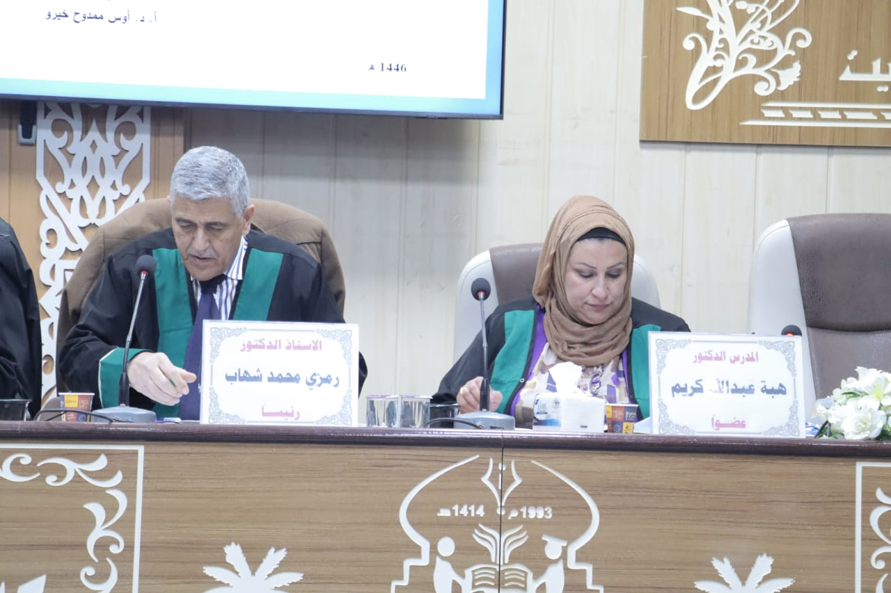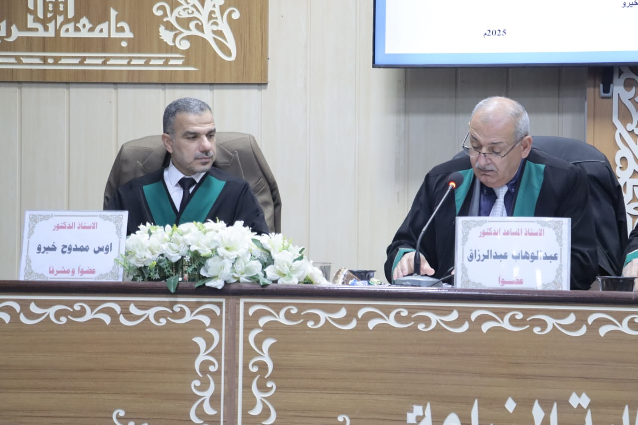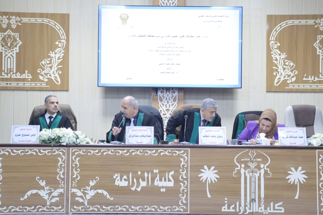 نوقشت في قسم التربة والموارد المائية بكلية الزراعة - جامعة تكريت مناقشة رسالة ماجستير للطالب صفاء شاكر حميد بعنوان (اختبار بعض معادلات تقدير غيض الماء في ترب مختلفة المحتوى الجبسي).. وتألفت لجنة المناقشة من: